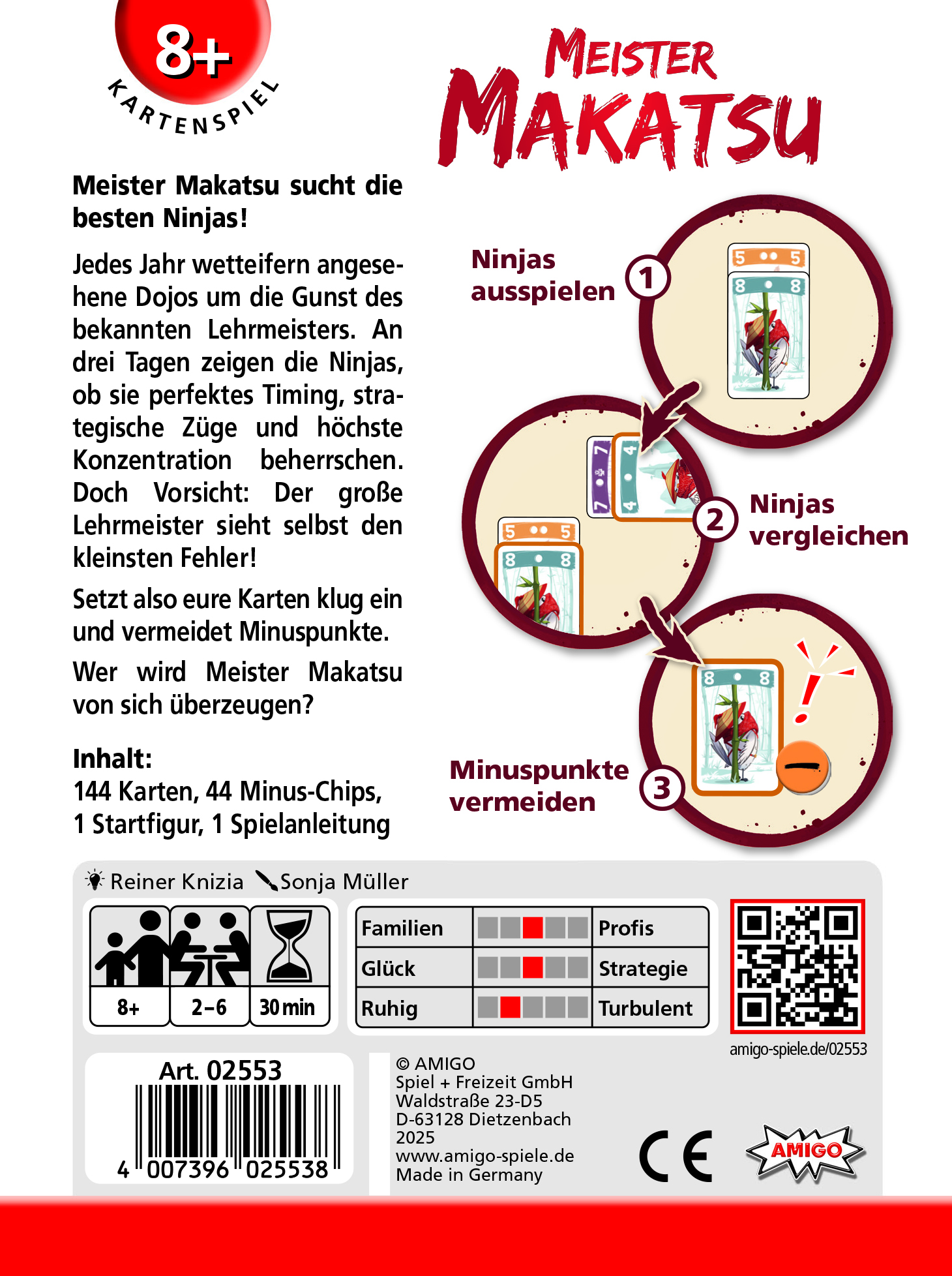 Aufgepasst, angehende Ninjas! Bei Meister Makatsu geht's darum, den großen Lehrmeister von deinen Fähigkeiten zu überzeugen. In diesem cleveren Kartenspiel von Star-Autor Reiner Knizia musst du mit Timing und Strategie punkten. Drei spannende Durchgänge mit jeweils 24 Karten warten auf dich. Aber Vorsicht: Jeder Fehler bringt Minuspunkte! Mit 144 Karten, 44 Minus-Chips und einer Startfigur ist alles für spannende Spielenachmittage dabei. Einfache Regeln, aber überraschende Tiefe - perfekt für Familien und Spielefans ab 8 Jahren.