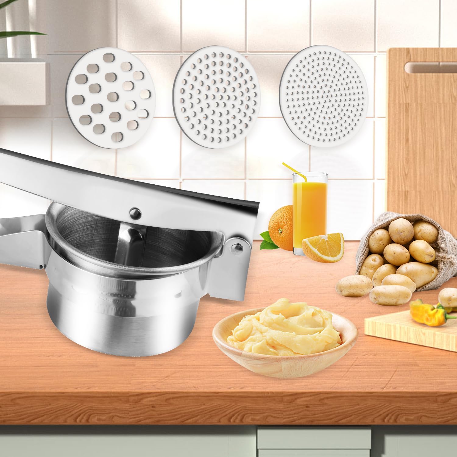 Perfekte Kartoffelpüree in Sekunden! Diese manuelle Kartoffelpresse aus Edelstahl macht aus gekochten Kartoffeln im Handumdrehen cremiges Püree ohne Klumpen. Mit 3 verschiedenen Siebeinsätzen kannst du die Konsistenz genau bestimmen - von fein bis grob. Auch super für Babybrei, Gemüse oder Obst. Der ergonomische Griff liegt perfekt in der Hand und das Haken-Design ermöglicht platzsparendes Aufhängen. Komplett aus spülmaschinenfestem Edelstahl - hygienisch sauber und rostfrei. Einfach zu reinigen, da alle Teile demontierbar sind. Maße: 29,5x9x11,5cm. Mach deine Küche zur Gourmet-Küche und genieße perfektes Püree wie beim Profi!
