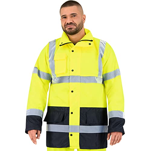 Endlich eine Warnschutzjacke die wirklich passt! Diese Marc & Mark Jacke gibt's in Übergrössen bis 10XL - perfekt für kräftige Männer. Nach ISO 20471:2013 Klasse 3 zertifiziert - maximale Sichtbarkeit und Sicherheit! Mit 8000er Wassersäule absolut wasserdicht, winddicht und trotzdem atmungsaktiv. Praktische Ausstattung: zwei Schubtaschen mit Reissverschluss, zwei Brusttaschen mit Klett, Napoleontasche und drei Stift-Fächer am Arm. Die Kapuze ist abnehmbar und verstellbar - super praktisch! Elastische Ärmelbündchen halten den Wind draussen. Grössen von 3XL (140cm Brust) bis 10XL (196cm Brust) - für jeden die passende Grösse! Perfekt für Bau, Strasse, Lager oder Gartenarbeit. Sichtbar sicher bei jedem Wetter!