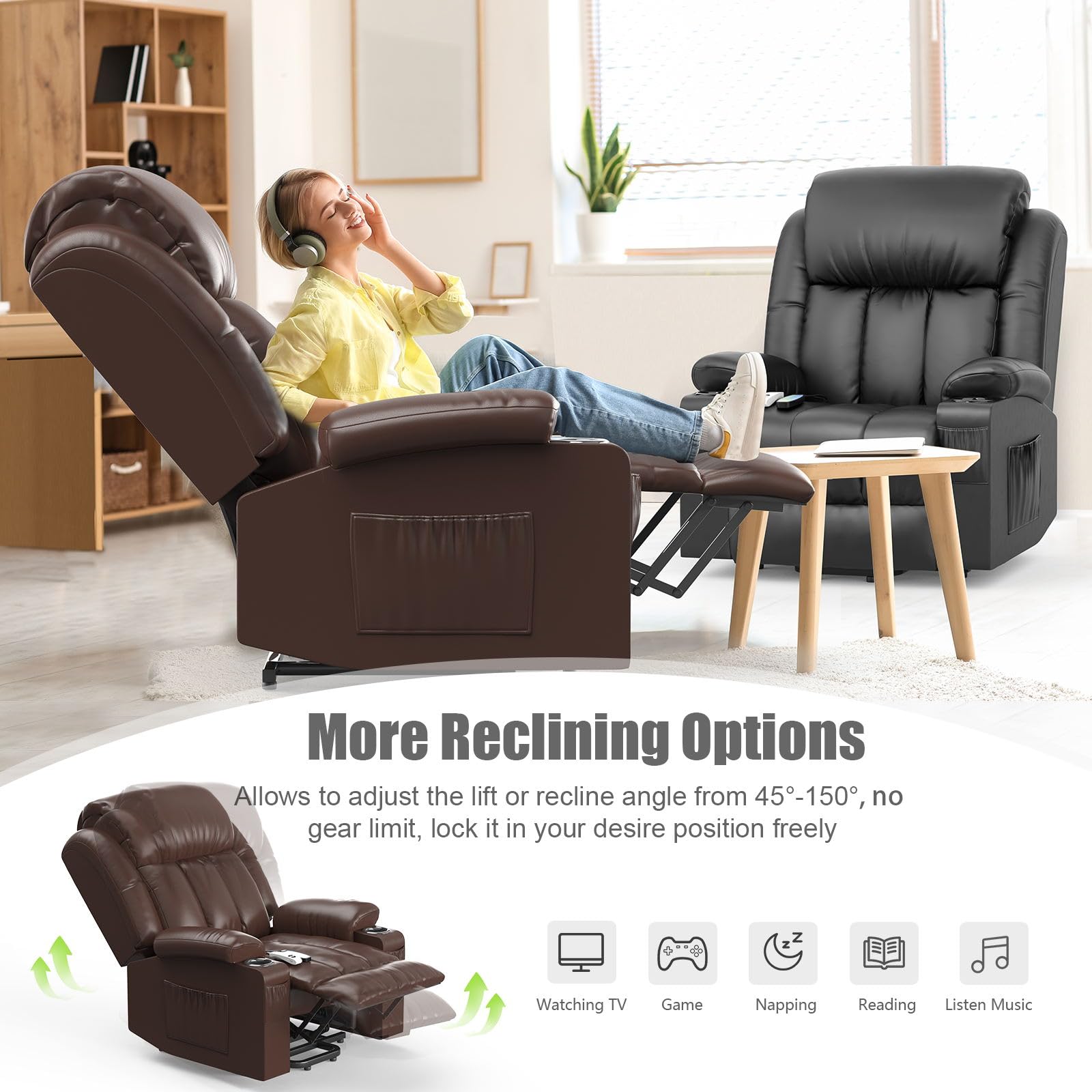 Entspannung pur mit diesem elektrischen Massagesessel! Der YONISEE hat alles, was du dir wünschst: 8 Massagepunkte, 5 Modi, 2 Intensitäten und sogar Wärmefunktion für den Rücken. Die Aufstehhilfe macht das Aufstehen super einfach - besonders praktisch für Ältere oder bei Rückenproblemen. Rückenlehne verstellbar von 90-150°, ausziehbare Fußstütze, versteckte Getränkehalter und USB-Anschlüsse. Extra breit (73cm Rückenlehne) und trägt bis 160kg. Einfache Montage - dein persönliches Wellness-Zentrum fürs Wohnzimmer!