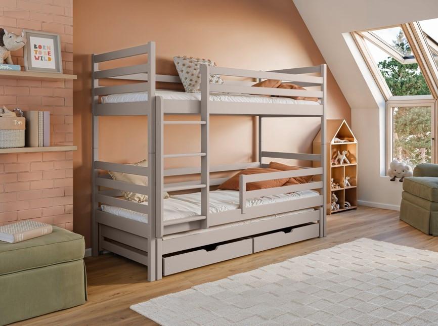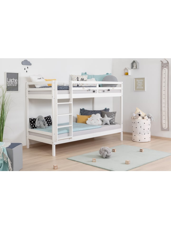 Platzwunder fürs Kinderzimmer! Dieses Etagenbett 'Finn' aus massiver Kiefer bietet zwei gemütliche Liegeflächen und jede Menge Stauraum. Mit fünf praktischen Schubkästen auf Rollen - ideal für Spielzeug, Kleidung oder Bettwäsche. Maße: 209cm breit, 151cm hoch, 96cm tief. Die Leiter kann wahlweise rechts oder links montiert werden - super flexibel für deine Raumaufteilung. Belastbar bis 75kg pro Liegefläche (nach DIN-Norm). Achtung: Nicht für Kinder unter 6 Jahren geeignet! Einfacher Selbstaufbau mit detaillierter Anleitung. Die lackierte Oberfläche in Weiß ist pflegeleicht - einfach mit Staubtuch reinigen. Perfekt für Geschwister oder Gästezimmer. Spart Platz und sieht dabei noch richtig gut aus! Aus nachhaltigem Kiefernholz - Qualität die hält.