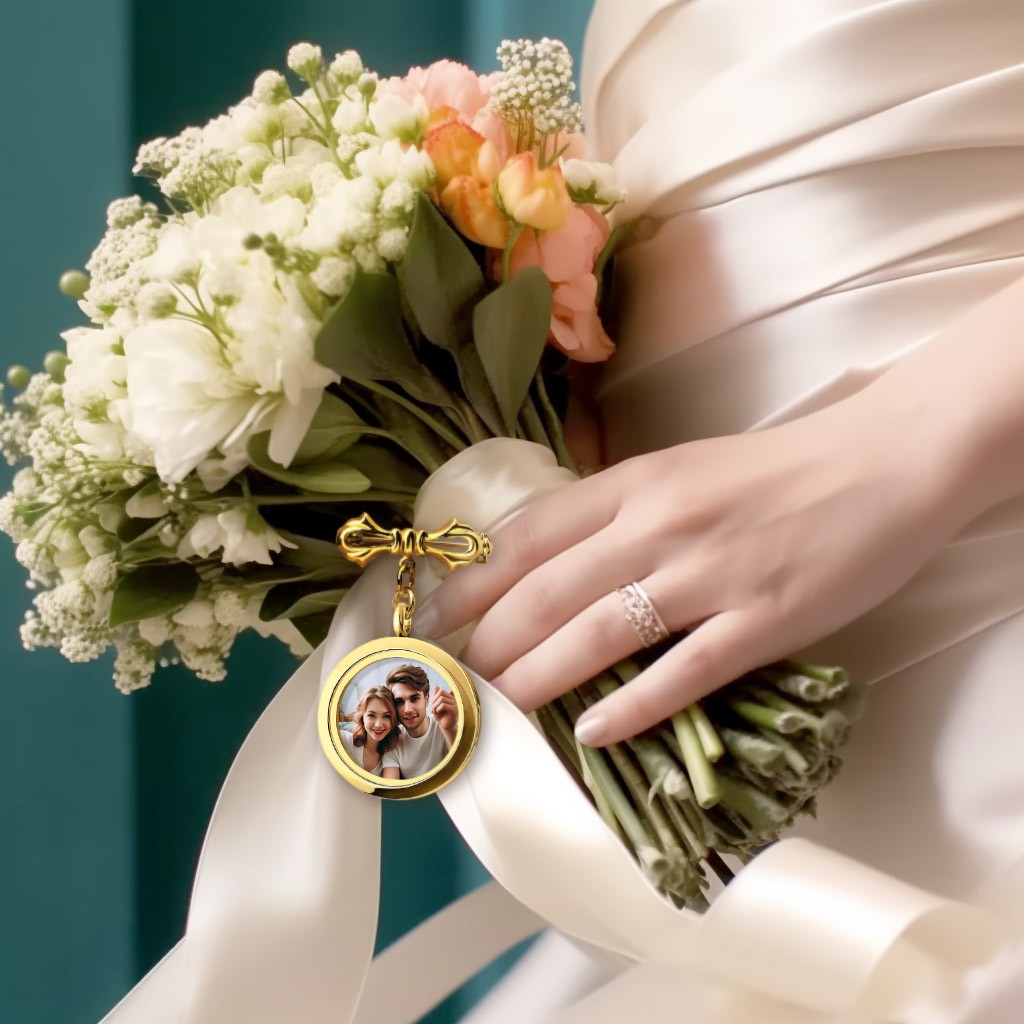 Oh, das ist so eine berührende Idee! Diese personalisierte Foto-Brosche von Custom4U ist perfekt für deine Hochzeit, wenn jemand besonderes nicht dabei sein kann. Du kannst 1-4 Fotos von lieben Menschen in die Brosche einfügen und sie dann an deinem Brautstrauß befestigen.