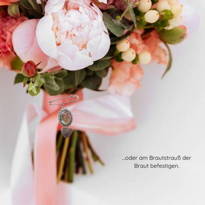 So fühlt es sich an, als wären sie doch irgendwie bei dir an deinem großen Tag. Die Brosche gibt es in verschiedenen Formen: Herz, oval oder rund, und in den Farben Silber, Gold oder Schwarz. Hergestellt aus hochwertigem 316L Edelstahl - nickelfrei, bleifrei und absolut hautverträglich.