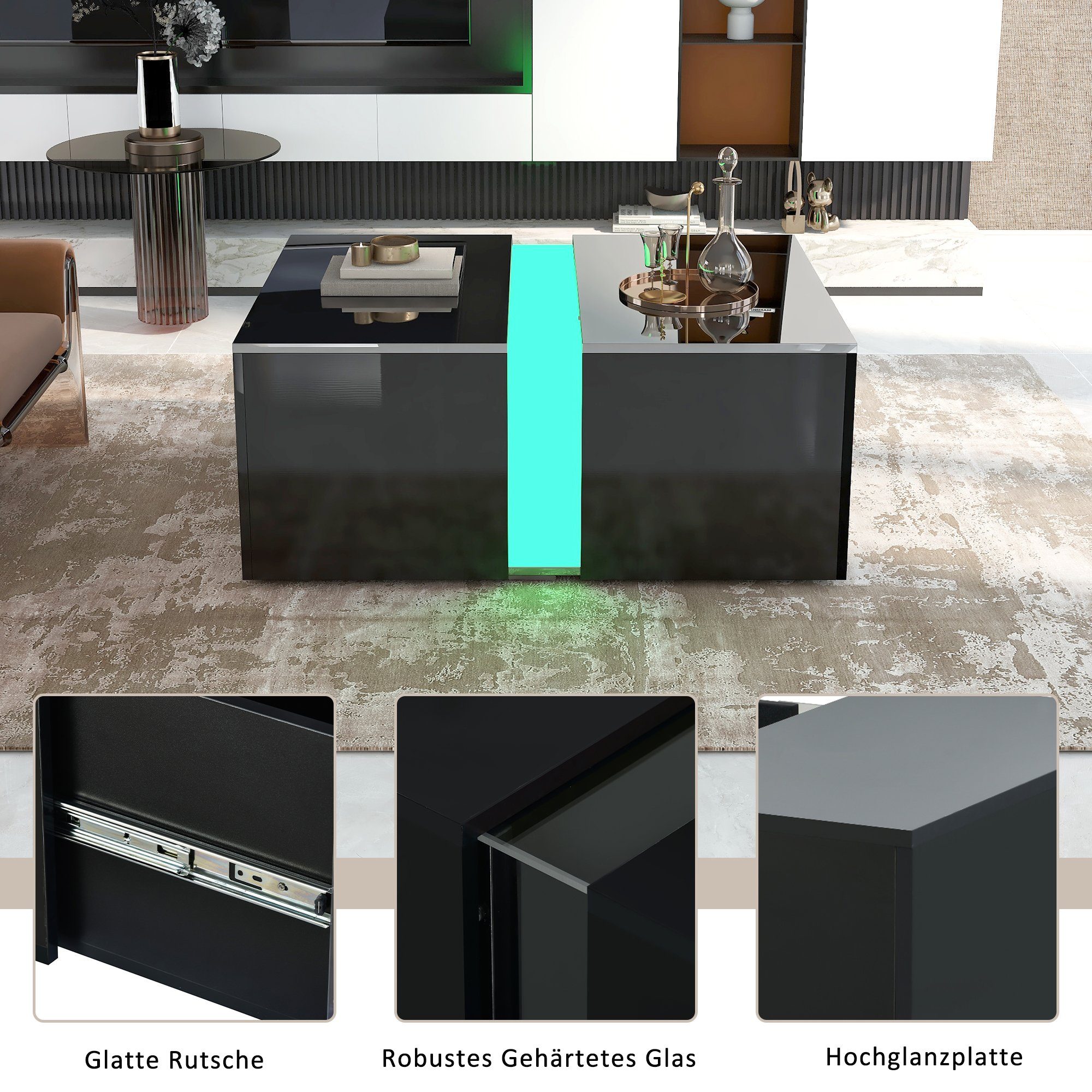 Wow-Effekt für dein Wohnzimmer! Dieser quadratische Couchtisch von Merax kombiniert modernes Design mit cleveren Funktionen. Mit 70x70 cm perfekt für kleine Räume. Die 2 Schubladen bieten Stauraum für Fernbedienungen, Zeitschriften und Kleinkram. Das absolute Highlight: Der LED-Lichtstreifen, den du per App steuern kannst! Verschiedene Farben, Helligkeitsstufen - create your mood! Aus Spanplatte mit gehärtetem Glas, stabil und pflegeleicht. USB-Anschluss für praktisches Laden (Adapter nicht inklusive). Mehr als nur ein Tisch - ein Eyecatcher!
