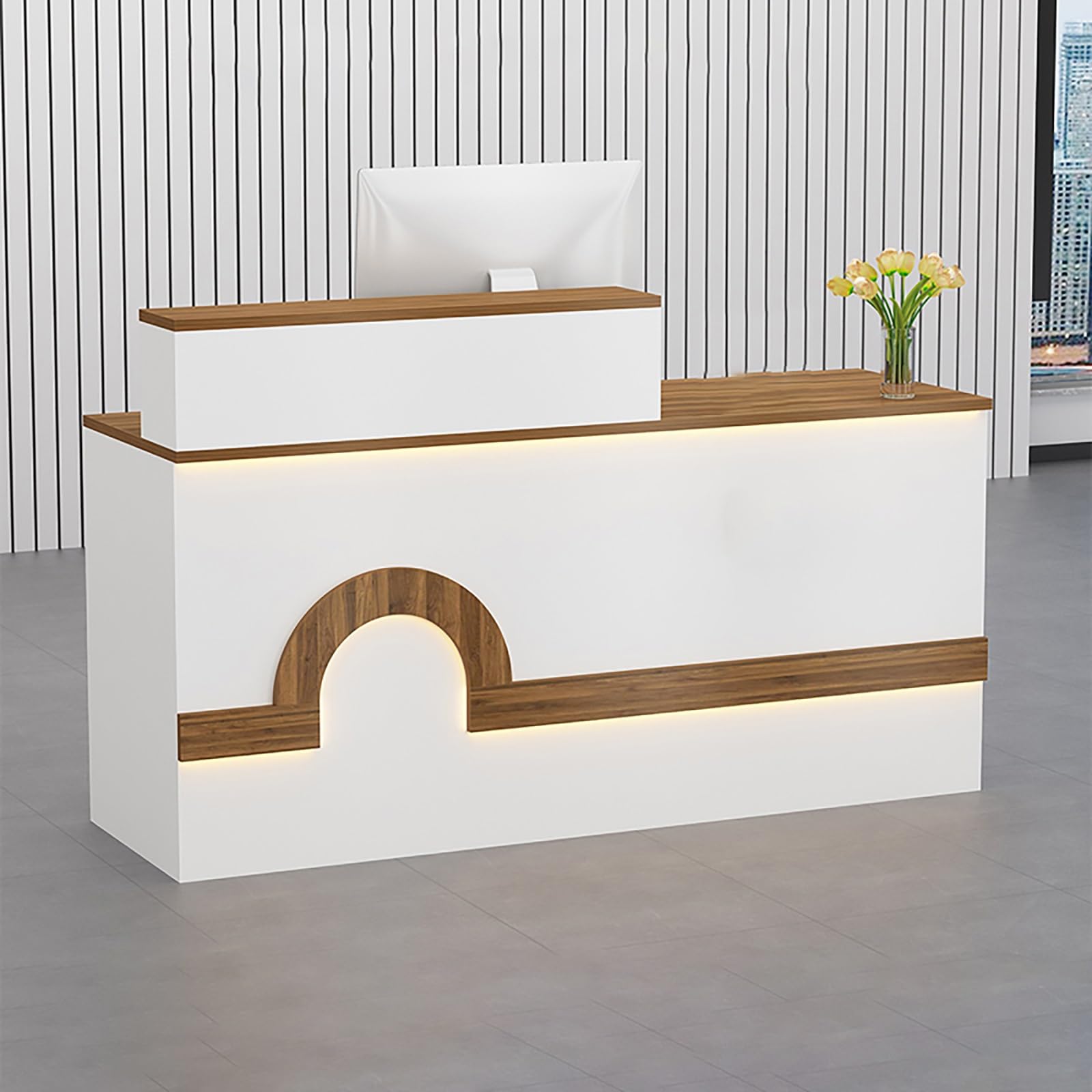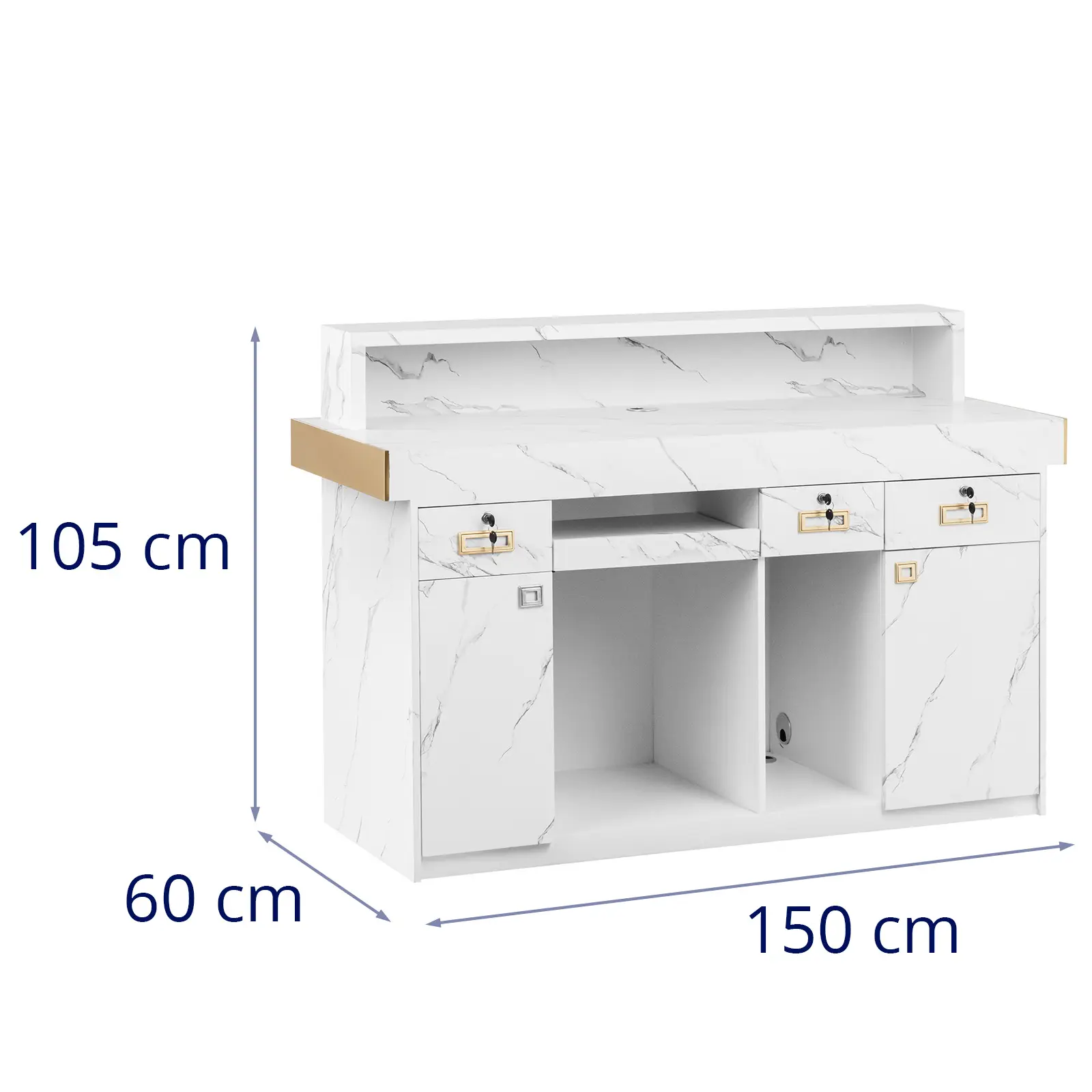 Professioneller Auftritt garantiert! Diese stylische Empfangstheke in Weiß mit den Maßen 140x60x100cm macht in jedem Büro, Hotel oder Salon eine gute Figur. Aus robustem Holzwerkstoff gefertigt, bietet sie reichlich Platz für Computer, Telefon und Arbeitsmaterial. Besonders praktisch: Die abschließbare Schublade für wichtige Dokumente und die ausziehbare Tastaturablage für mehr Ordnung. Mit integrierter LED-Beleuchtung für eine einladende Atmosphäre. Die Metallschienen sorgen für sanftes Öffnen und Schließen. Perfekt für Rezeptionen, Praxen oder Verkaufsräume. Einrichtung leicht gemacht - dieser Tresen bringt sofort professionelles Flair in deine Räumlichkeiten!