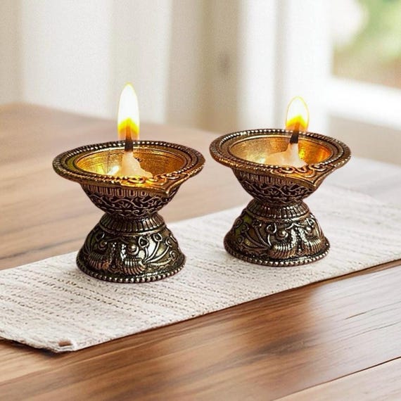 Wunderschöne handgefertigte Diya-Lampe aus Messing! Diese traditionelle indische Öllampe mit feiner Kuber-Gravur verbreitet magisches Flair bei jedem Fest. Mit 3,8 cm Höhe und 5,8 cm Durchmesser ist sie perfekt für Tischdekorationen. Die goldene Farbe leuchtet warm und gemütlich - ideal für besondere Anlässe wie Diwali, Hochzeiten oder spirituelle Zeremonien. Im Lieferumfang sind 20 Baumwolldochte enthalten - du kannst sofort loslegen! Diyas symbolisieren Erleuchtung und Wissen - eine tiefe Bedeutung hinter schöner Optik. Perfekt für Zuhause, Büro oder Tempel - schafft sofort eine besondere Atmosphäre. Auch als Geschenk eine tolle Idee für Freunde und Familie. Die natürlichen Farbunterschiede machen jedes Stück einzigartig - eben echtes Handwerk!