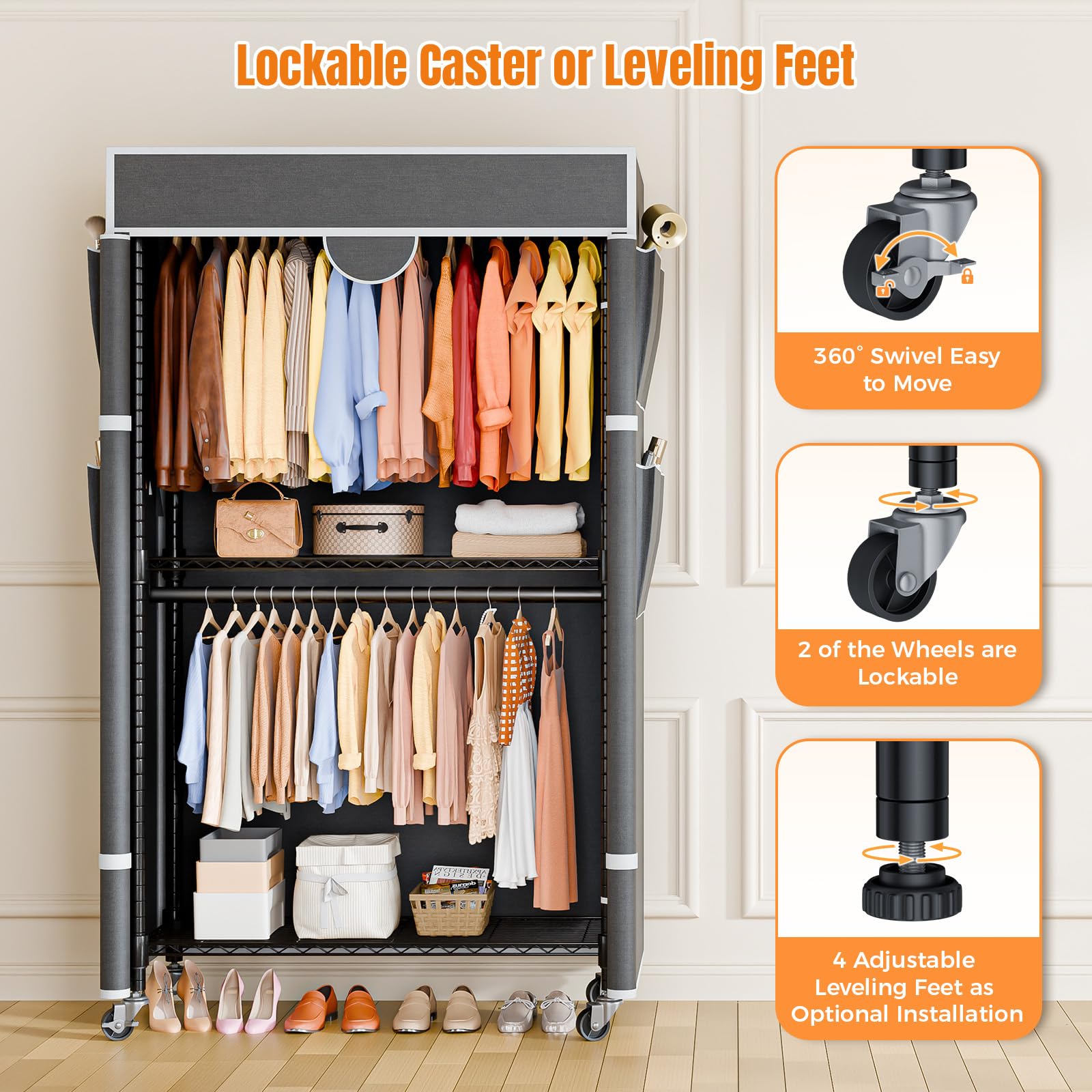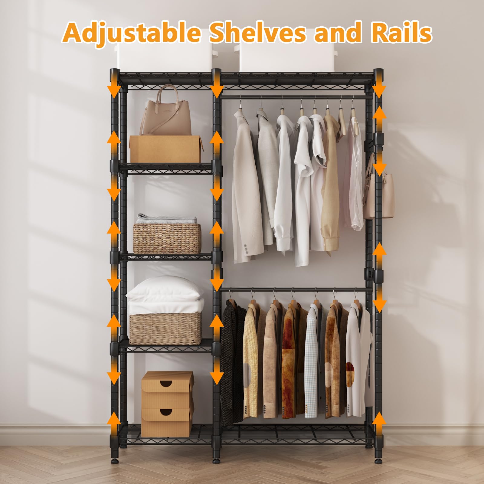 Endlich Ordnung im Kleiderschrank! Der Himimi Kleiderständer aus robustem Metall ist deine Lösung für alle Aufbewahrungsprobleme. Mit stattlichen 195 cm Höhe und 114 x 44 cm Grundfläche bietet er unheimlich viel Stauraum. Das beste Feature: 5 höhenverstellbare Regale, die du ganz nach deinen Bedürfnissen anpassen kannst - ob für Pullover, Jeans oder Schuhe. Zwei stabile Kleiderstangen nehmen deine Hemden, Jacken und Kleider auf, ohne Knitterfalten. Die maximale Belastung von 250 kg ist absolut beeindruckend - da kannst du wirklich alles unterbringen. Die seitlichen Haken sind perfekt für Taschen, Hüte oder Schlüssel. Das geniale Stecksystem macht die Montage zum Kinderspiel - komplett ohne Werkzeug! Die verstellbaren Füße sorgen für stabilen Stand auch auf unebenen Böden. Perfekt fürs Schlafzimmer, den Flur oder als zusätzlicher Stauraum im Home-Office. Aus pulverbeschichtetem Stahl, ist der Ständer rostresistent und super langlebig. Einfach aufbauen und sofort nutzen - deine Kleidung wird es dir danken!