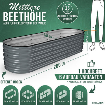 Endlich eigenes Gemüse anbauen! Dieses GRUNA Hochbeet aus Metall macht Gärtnern super einfach - auch ohne grünen Daumen.\n\nMaße: 200 x 60 x 42 cm - perfekte Arbeitshöhe ohne Bücken! Aus rostfreiem Zn-Al-Stahl der 15-25 Jahre hält - ganz ohne Rost oder spezielle Pflege.\n\nDas geniale 6-in-1 System:\n• 10 Wellbleche die du in 6 verschiedenen Formen aufbauen kannst\n• Modular - mehrere Beete kombinierbar\n• Flexibel anpassbar an deinen Garten\n\nIm Lieferumfang ist alles dabei:\n• Wühlmausgitter gegen lästige Nager\n• Verstrebungen für extra Stabilität\n• Werkzeug für den Aufbau\n• Ausführliche Anleitung\n\nAufbau dauert nur ca. 1,5 Stunden - auch alleine machbar. Einfach die Schrauben festziehen und schon steht dein Beet! Kein Boden bedeutet direkten Erdkontakt für deine Pflanzen.\n\nPerfekt für:\n• Gemüse und Kräuter\n• Blumen und Stauden\n• Balkon (Achtung: Gewicht prüfen!)\n• Terrasse mit Drainage\n\nDu kannst das Beet auch auf Stein oder Beton stellen - wichtig ist nur dass Wasser abfließen kann. Eine Drainageschicht aus Kies hilft dabei.\n\nSuch dir einen sonnigen Platz (4-6 Stunden Sonne täglich) und leg los! Der Boden sollte idealerweise aufgelockert sein - aber muss nicht.\n\nMit diesem Hochbeet startest du direkt durch - keine Folie nötig, einfach befüllen und pflanzen. Dein Traum vom eigenen Garten wird wahr!