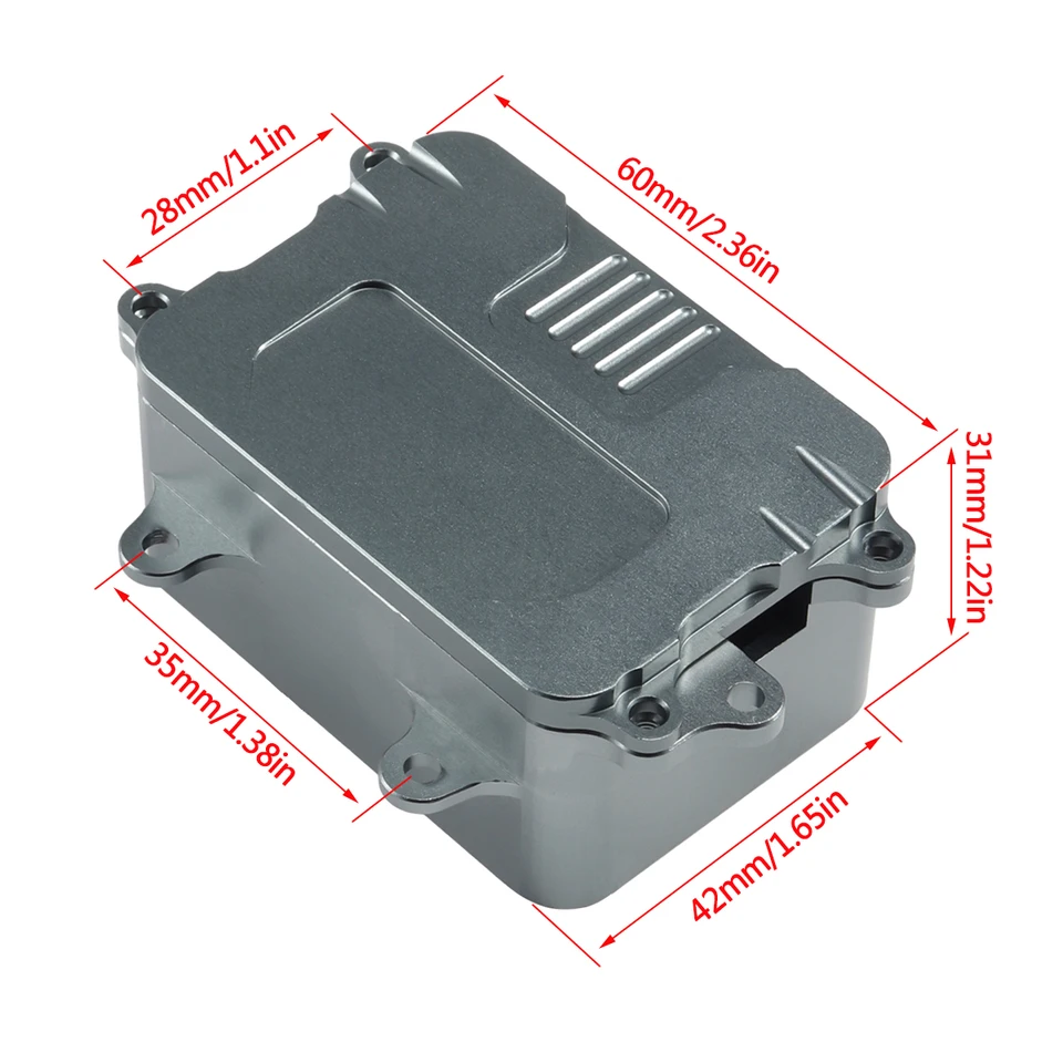 Schütz deine teure RC-Elektronik mit dieser robusten Metall-Empfängerbox! Aus hochwertigem Aluminium gefertigt, ca. 60x40x30 mm groß und in silber erhältlich. Passt perfekt für SCX10, D90, D110 und andere 1/10 RC Crawler. Einfache Montage mit den mitgelieferten 8 Schrauben und 4 Muttern. Das leichte Metallgehäuse schützt vor Staub, Schmutz und Stößen, ohne viel Extra-Gewicht zu bringen. Dein Empfänger, ESC und andere Elektronik sind damit bestens geschützt. Ob für Geländefahrten oder Racing - mit dieser Box machst du nichts verkehrt. Ein Muss für jeden ernsthaften RC-Fan!