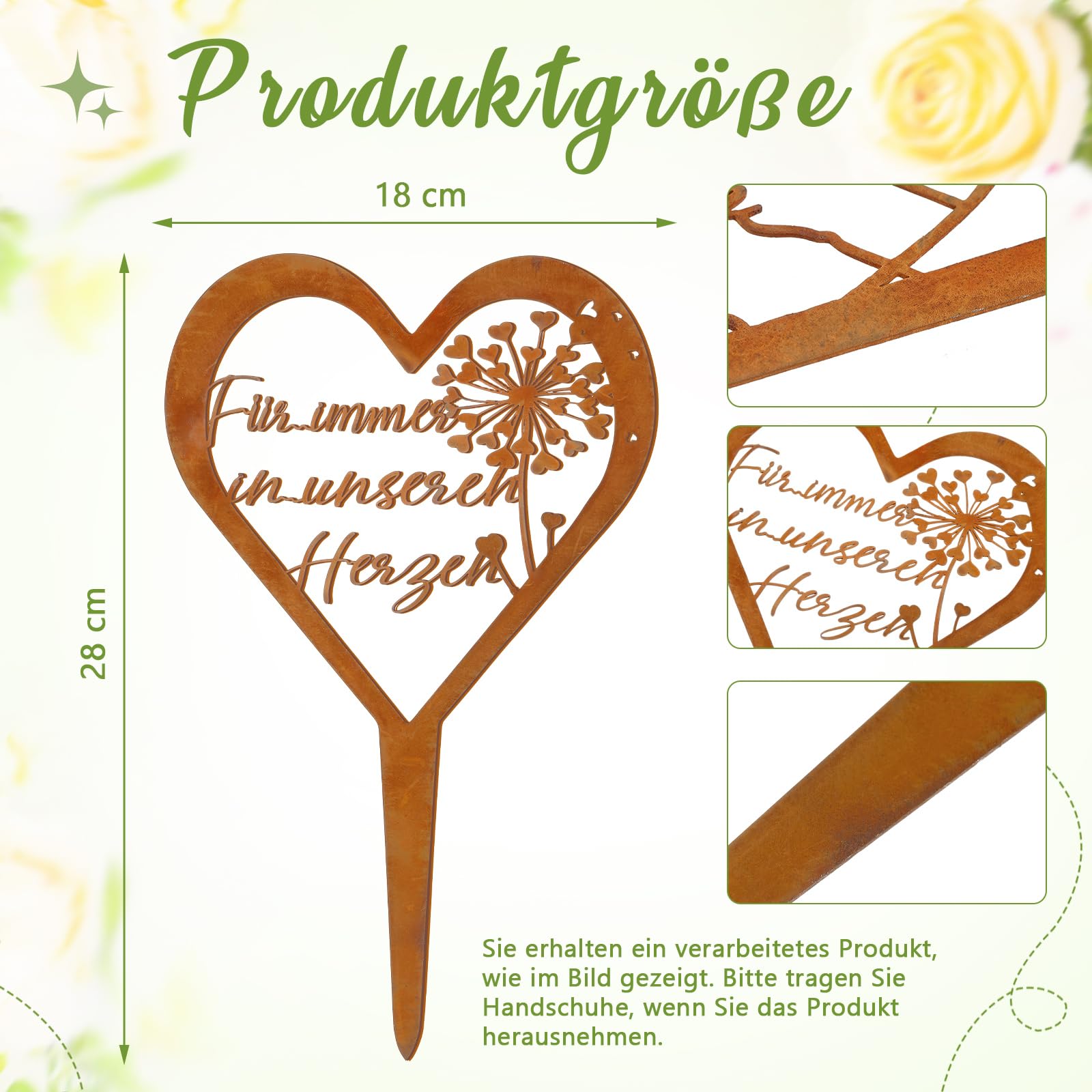 Ein zärtliches Andenken für deine Liebsten! Dieser wunderschöne Grabstecker in Herzform aus robustem Metall ist die perfekte Art, Erinnerungen wachzuhalten. Mit den Maßen 28 x 18 cm ist er ein dezentlicher und doch ausdrucksstarker Grabschmuck. Die Aufschrift 'Für immer in unseren Herzen' begleitet von einem filigranen Löwenzahn-Motiv drückt auf einfühlsame Weise deine Verbundenheit aus. Die wetterfeste Verarbeitung sorgt dafür, dass der Stecker Wind, Regen und Sonne standhält - perfekt für den ganzjährigen Einsatz auf dem Friedhof. Die lange Bodenspitze gewährleistet stabilen Halt selbst bei starkem Wind. Durch den natürlichen Rostprozess wird jedes Stück zu einem Unikat mit ganz eigenem Charakter. Einfach in die Erde stecken und deine persönliche Botschaft der Liebe und des Gedenkens setzen. Ideal für Gräber, Gärten, Höfe oder Rasenflächen. Ein tröstliches Geschenk für Freunde oder Familienmitglieder in Trauer. Die rustikale Optik passt sowohl zu modernen als auch traditionellen Grabgestaltungen. Ein zeitloses Symbol der Zuneigung, das deine Erinnerungen für die Ewigkeit bewahrt. Einfach in der Handhabung und von bleibender Schönheit.