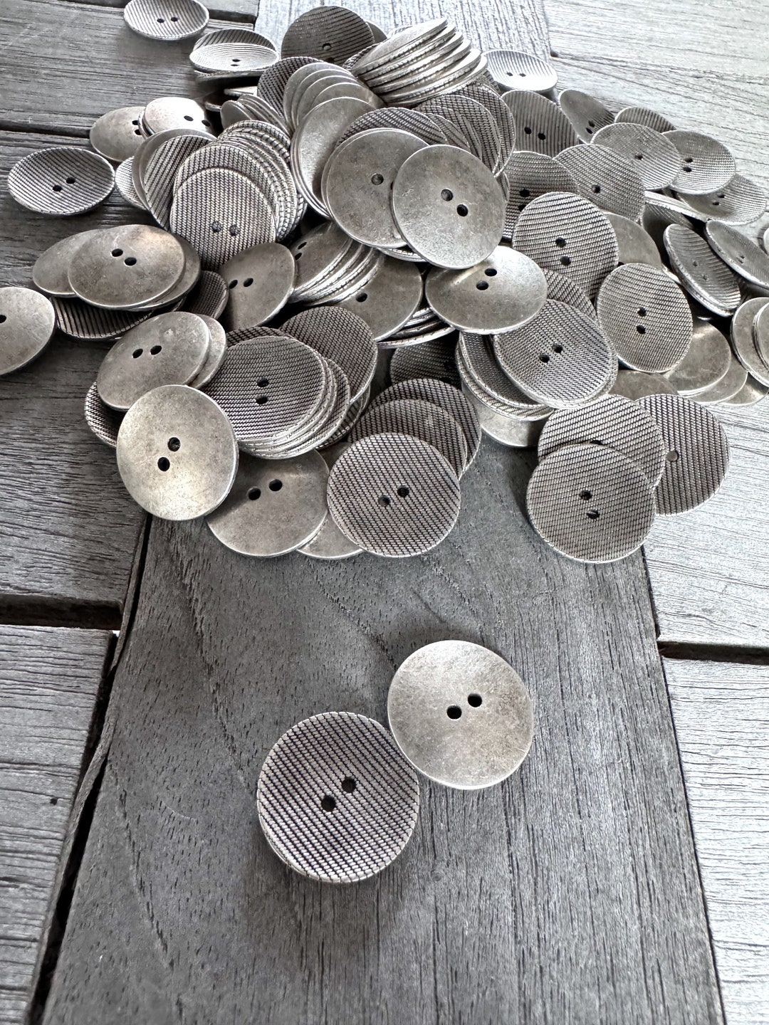 Schicke Metallknöpfe in modernem Design! Komplett matt silber, teilweise geschwärzt für den besonderen Look. Mit 4 Löchern zum Annähen. Erhältlich in 18mm, 23mm oder 30mm Durchmesser - hier im 30mm Format. 5 Stück im Set, made in Europe. Perfekt für Jacken, Hemden oder Accessoires. Machen jedes Kleidungsstück zum Hingucker!