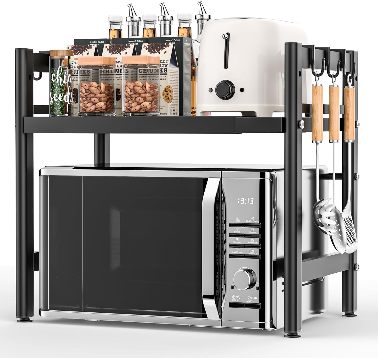 Boah, dieses Bambus-Regal ist echt die Rettung für jede unordentliche Küche! Mit zwei praktischen Ebenen und vier Haken bringst du sofort mehr System in deinen Küchenalltag. Oben stellst du bequem deine Mikrowelle ab, unten finden Gewürze, Kochutensilien oder Vorratsdosen ihren Platz. Die Haken sind perfekt für Kochlöffel, Schneebesen oder Küchentücher. Das coole Feature: Die Höhe der oberen Platte lässt sich frei anpassen - einfach um die reservierten Löcher im Seitenrahmen verschieben. So passt du das Regal optimal an deine Geräte an! Aus stabilem Bambus gefertigt, ist es nicht nur umweltfreundlich, sondern auch richtig robust. Trägt problemlos bis zu 22 kg - da kannst du ohne Bedenken auch schwere Küchengeräte unterbringen. Das offene Design sorgt für gute Belüftung und schützt gleichzeitig vor Feuchtigkeit. Montage ist übrigens kein Hexenwerk - alles Nötige liegt bei. Maße: 55x35x42 cm, obere Ebene 52 cm lang. Einfach genial, wie viel Platz du damit sparst!