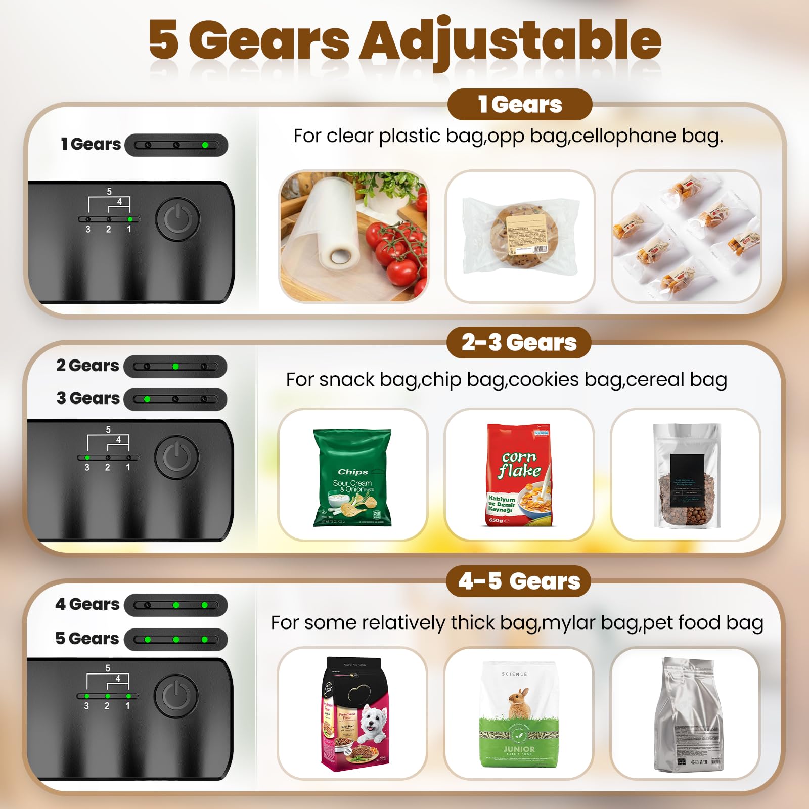 Tipp: Für empfindliche Verpackungen die niedrigste Stufe wählen, für dickere Beutel eine höhere Stufe.