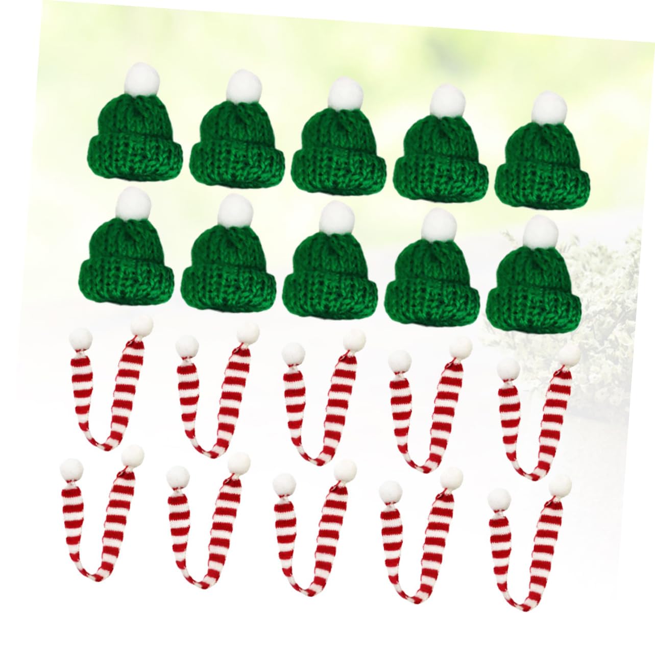 Super süße Weihnachtsdekoration für Dein Zuhause! Dieses Set enthält 15 Mini-Mützen und 15 passende Schals in verschiedenen Designs. Perfekt zum Dekorieren von Flaschen, Geschenken oder als Baumschmuck. Die Mützen haben weiße Pompons und sind aus weichem gebürstetem Stoff gefertigt. Größe: Mützen 4,5x3,5cm bis 7x4,8cm, Schals 18x1cm. Ideal für Weihnachtsfeiern, als Geschenkanhänger oder zur Verschönerung Deiner Weihnachtsdekoration. Macht jeden Gegenstand sofort weihnachtlich. Einfach zu verwenden und wiederverwendbar. Bring Weihnachtsstimmung in Dein Zuhause!