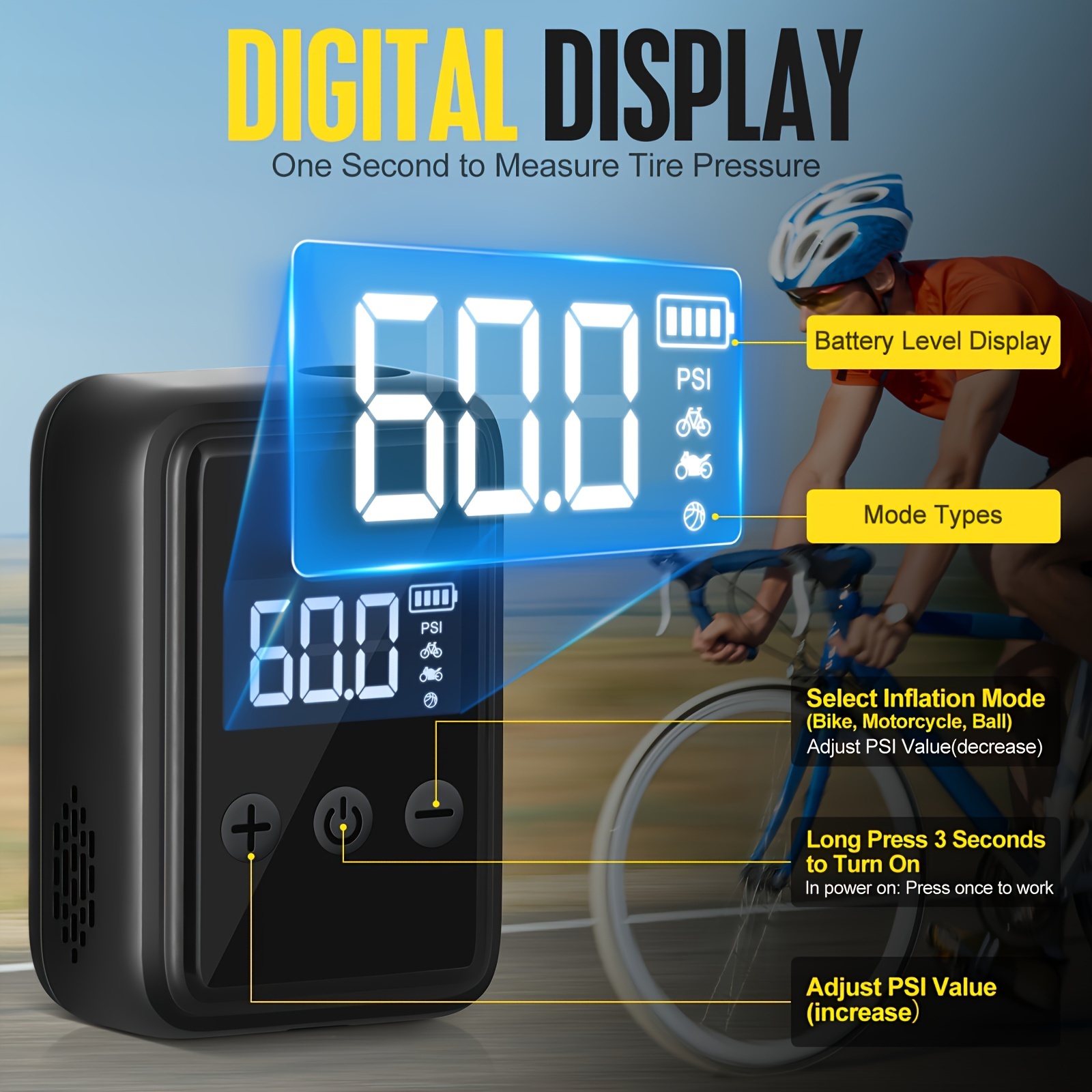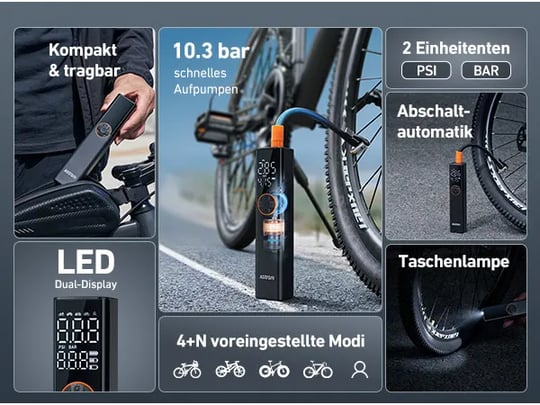 Nie wieder mühsam Reifen aufpumpen! Diese elektrische Mini-Fahrradpumpe ist dein neuer bester Freund auf Radtouren. Super klein (nur 7,6 x 5,1 x 3,4 cm) und leicht (157 g) passt sie in jede Tasche. Der 1300-mAh-Akku hält lange - damit pumpst du locker 7 Mountainbike-Reifen oder 3 Rennrad-Reifen auf. Das digitale LED-Manometer zeigt dir live an, wie viel Druck auf dem Reifen ist, und du kannst bis 120 PSI einstellen. Total praktisch: Sie passt auf Presta UND Schrader Ventile, also wirklich für alle Fahrradtypen geeignet. Mit der bürstenlosen Motortechnologie geht's ratzfatz - in nur 46 Sekunden bist du bei 36 PSI! Und keine Sorge vor Überdruck: Die Pumpe stoppt automatisch. Mit Temperatur- und Überstromschutz ist alles safe dabei. Im Lieferumfang findest du sogar ne Halterung, ne Aufbewahrungstasche und verschiedene Aufsätze. Einfach aufladen und los geht's - Reifen aufpumpen war noch nie so easy!