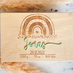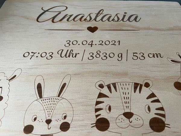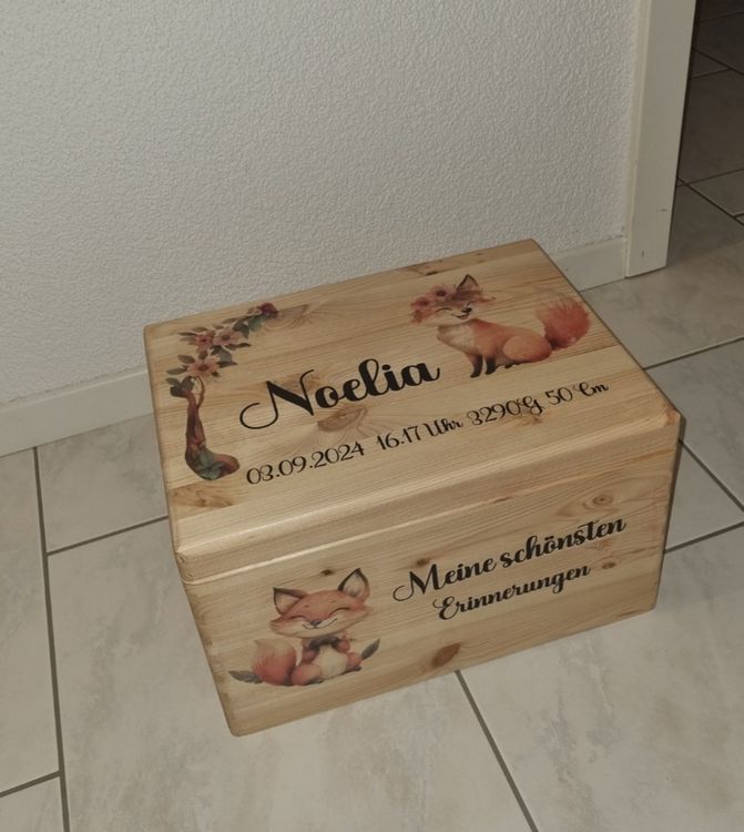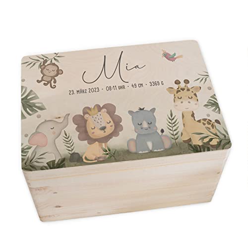 Bewahre die schönsten Kindheitserinnerungen in dieser personalisierten Holzkiste von minimutz auf! Jede Kiste wird mit dem Namen deines Kindes und den Geburtsdaten individualisiert - so wird sie zu einem ganz besonderen Einzelstück. Das bunte Safari-Design mit niedlichen Tieren passt perfekt ins Kinderzimmer. Aus robustem, unbehandeltem Holz gefertigt, mit praktischem Klappdeckel zum Schutz vor Staub. Ob erster Schnuller, Lieblingsstrampler, Locke, Fotos oder die schönsten Zeichnungen - hier findet alles Platz! Die Abmessungen (30x20x14 cm) bieten reichlich Stauraum. Der UV-Druck ist nach Spielzeugnorm EN71-3 zertifiziert und absolut ungiftig. Ein wunderbares Geschenk zur Geburt, Taufe oder zum Geburtstag - eine Schatzkiste, die ein Leben lang Freude bereitet! Einfach auf 'Jetzt anpassen' klicken und persönliche Gestaltung starten.