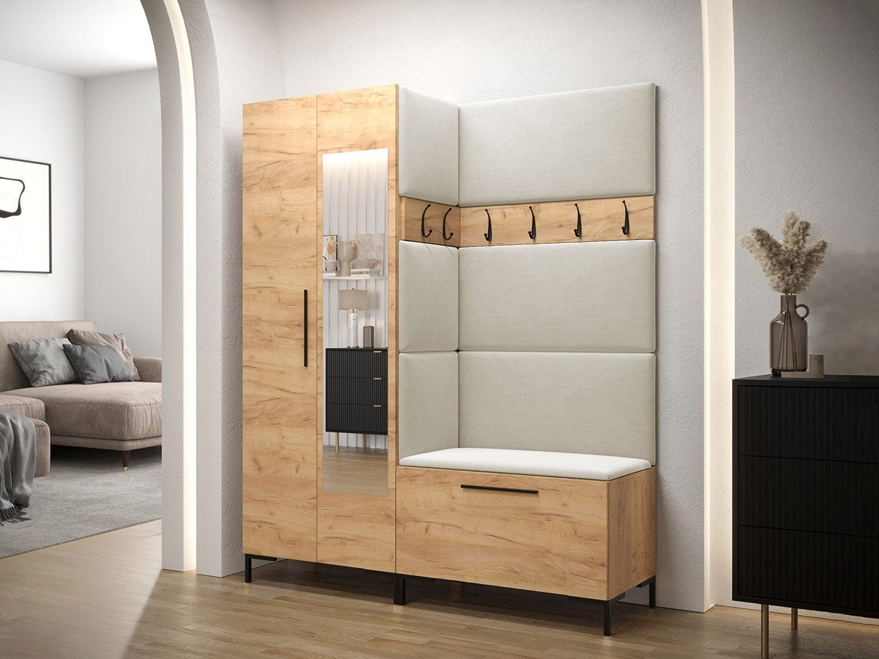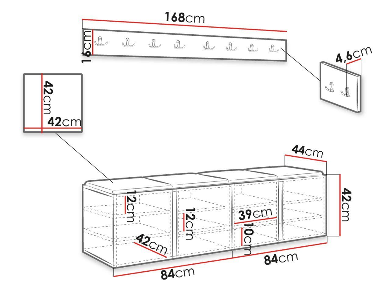 Endlich Ordnung im Flur! Dieses komplette Garderoben-Set Monati V hat alles was du brauchst: 4 Schuhschränke plus Kleiderhakenbrett plus gepolsterte Sitzbank - praktischer geht's kaum. Maße: 168 cm breit, 186 cm hoch, 45,6 cm tief - also Platz ohne Ende für Schuhe, Jacken und Taschen. In schicker Eiche Artisan/Schwarz Optik - sieht einfach klasse aus. Das Kleiderhakenbrett hat 8 Haken für Jacken, Taschen und Co. Die Sitzbank ist gepolstert und schützt gleichzeitig die Wand. Alles aus 16 mm Laminat mit PVC-Kanten - robust und langlebig. Wird in mehreren Paketen geliefert mit Aufbauanleitung, Montage-Service gibt's leider nicht. Aber der Aufbau ist machbar, versprochen! Perfekt für Familien, Paare oder alle die Ordnung lieben. Dein Flur wird vom Chaos-Zone zur Wohlfühl-Oase. Einrichtungs-Profi-Tipp: Passt super in meisten Flure und Eingangsbereiche!