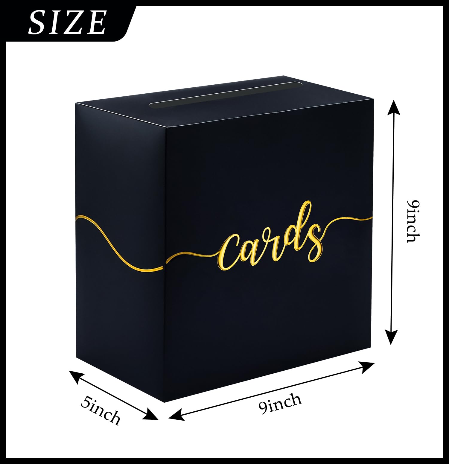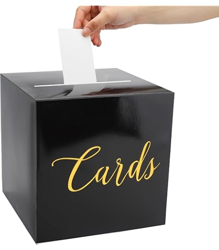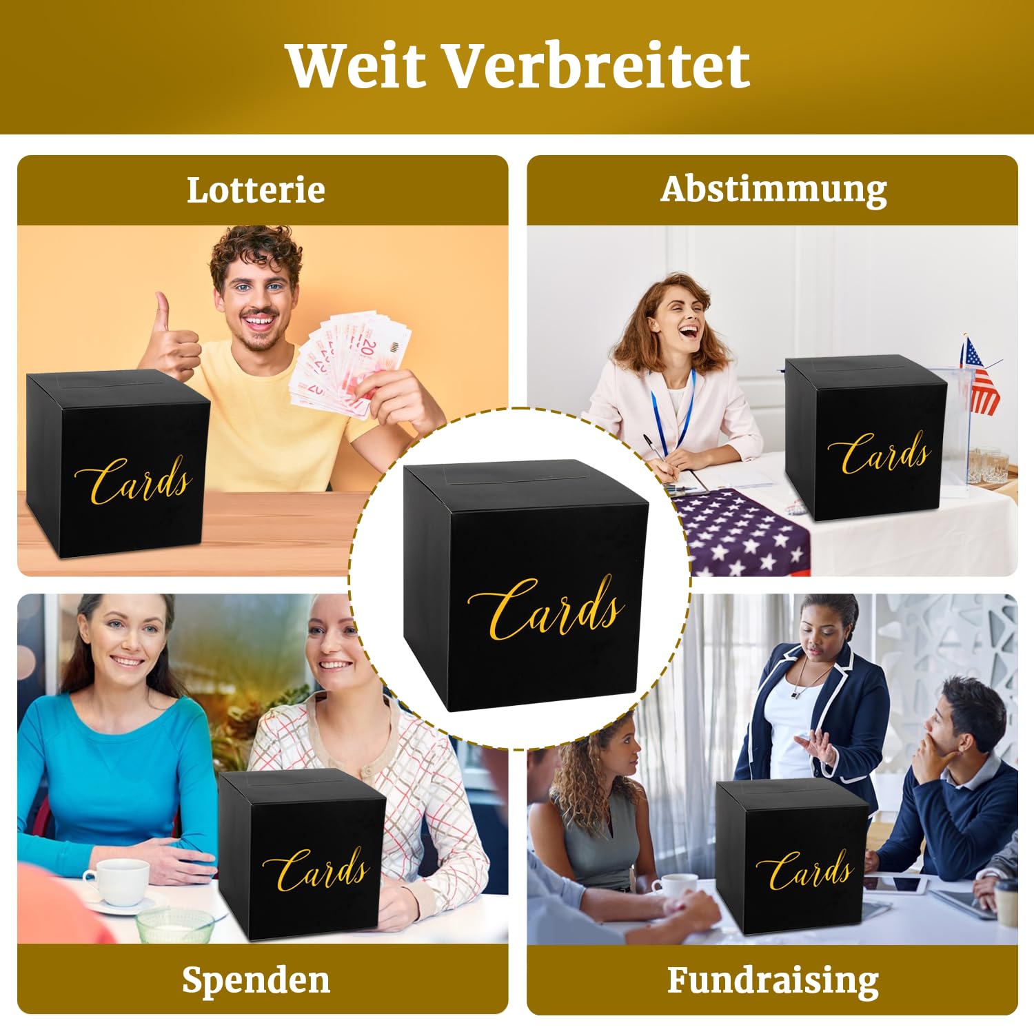 Die perfekte Lösung für Geldgeschenke auf deiner Hochzeit! Diese elegante Kartenbox in Schwarz mit Goldfolien-Design ist nicht nur praktisch, sondern auch ein echter Hingucker.\n\nMaße: 22x22x22cm - groß genug für alle Karten und Umschläge. Aus hochwertigem, stabilem Karton der lange hält.\n\nIm Lieferumfang enthalten:\n- 1x Kartenbox zum Zusammenfalten\n- 10x passende Grußkarten\n\nDas moderne, minimalistische Design fügt sich perfekt in jede Hochzeitsdekoration ein. Der integrierte Schlitz sorgt dafür, dass alle Karten und Geldgeschenke sicher verwahrt werden.\n\nEinfache Montage:\n- Kein Werkzeug nötig\n- Einfach aufklappen\n- Nach der Feier wieder zusammenfalten\n- Platzsparend zu verstauen\n\nNicht nur für Hochzeiten geeignet, sondern auch für:\n- Babypartys und Baby-Duschen\n- Geburtstagsfeiern\n- Jubiläen und Abschlussfeiern\n- Spendenaktionen\n\nMach deine Feier noch organisierter und stylischer! Deine Gäste werden die praktische Box lieben und du hast alle Geschenke sicher an einem Ort.\n\nMit 90 Tagen Kundenservice - falls mal was sein sollte, kümmern wir uns sofort!