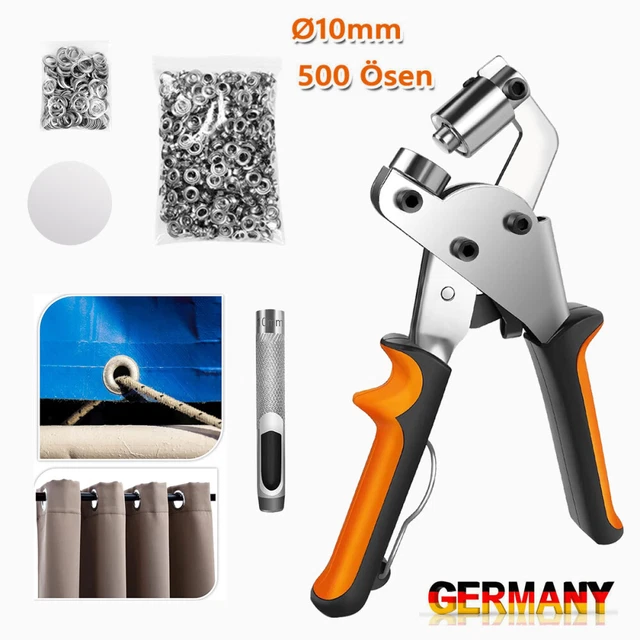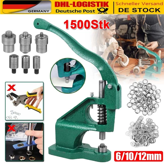 Perfekt für alle, die mit Stoffen, Leder oder Planen arbeiten! Dieses Ösenpresse Set hat alles, was du brauchst: Die robuste Handpresse aus Metall, drei austauschbare Matrizen (6mm, 10mm, 12mm) und satte 1500 Ösen! Damit setzt du nicht nur Ösen, sondern auch Druckknöpfe, Hohlnieten und Jeansknöpfe. Einfach an der Tischkante montieren oder freihändig benutzen - total flexibel. Die Matrizen wechselst du schnell aus, je nachdem was du gerade brauchst. Ob für Banner, Zelte, Taschen, Kleidung oder Planen - die Ergebnisse sind immer sauber und präzise. Super für Handwerker, Schneider oder DIY-Fans. Mit den 1500 Ösen im Set (500 pro Größe) hast du erstmal genug Vorrat für viele Projekte. Einfach klasse für alle, die professionell arbeiten wollen ohne teures Profi-Equipment!
