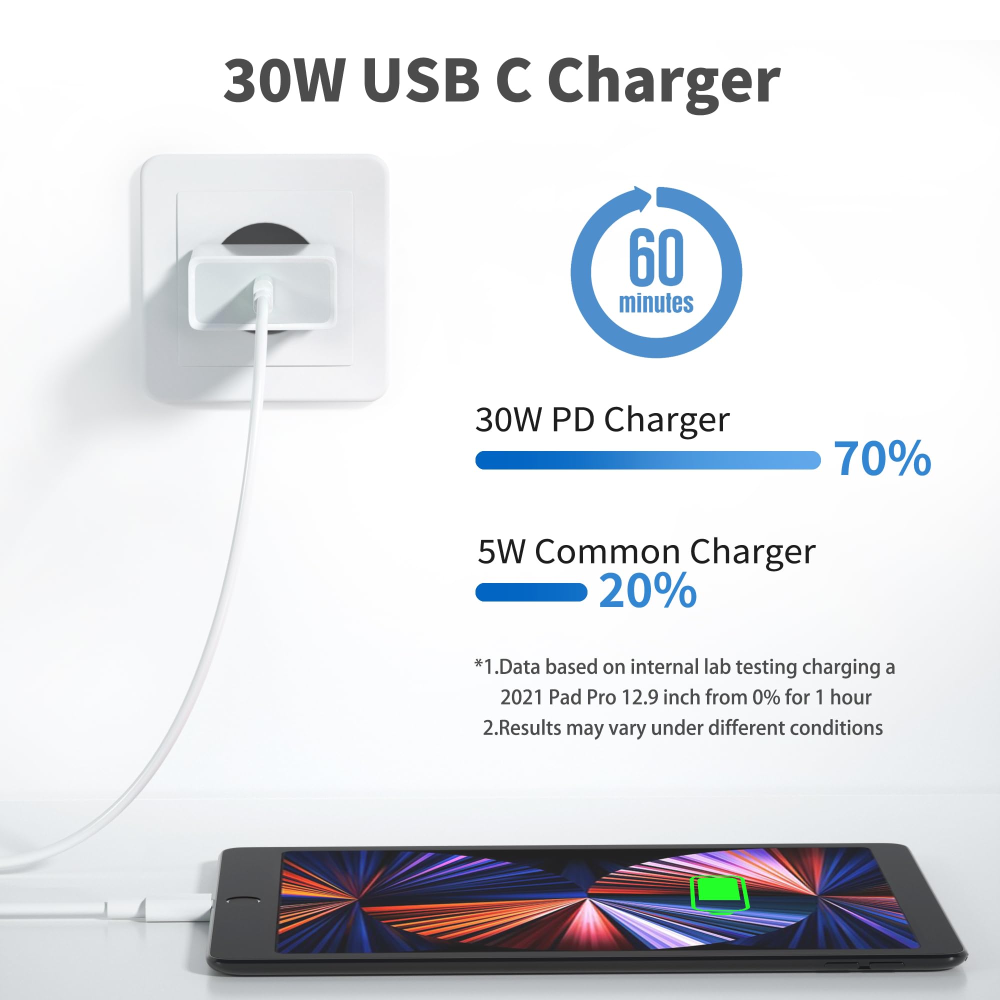 Schnellladen war noch nie so einfach! Dieses 30W USB-C Ladegerät lädt dein iPad Pro 13 Zoll in 30 Minuten auf 50% und dein iPhone 16/15 sogar auf 70%. Mit dem 2m langen USB-C zu C-Kabel hast du genug Reichweite. Sicher durch feuerfeste Hülle und intelligentem Management-Chip gegen Überhitzung und Kurzschluss. Kompatibel mit allen neuen iPad Pro, iPad Air, iPad Mini und iPhone Modellen. Perfekt für zu Hause, Büro oder Reisen. Set inklusive Netzteil und Kabel. Nie wieder langsam laden - hol dir die Power die du brauchst!