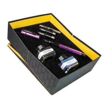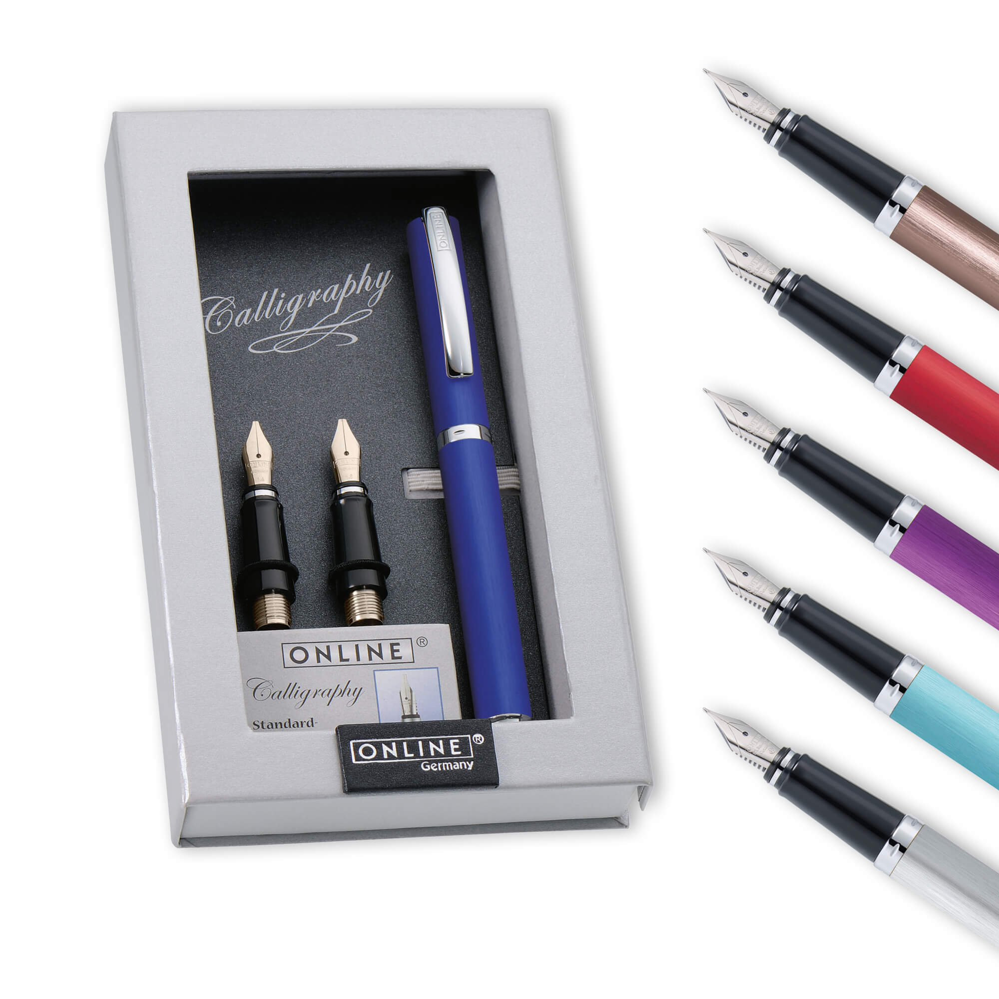 Kalligrafie-Fans aufgepasst! Dieses ONLINE Kalligrafie-Set ist der absolute Traum für alle, die schön schreiben wollen. Der elegante lila Füllhalter aus gebürstetem Aluminium liegt super in der Hand. Mit drei verschiedenen Federn in 0,8mm, 1,4mm und 1,8mm Stärke kannst du alle möglichen Schriftarten ausprobieren. Die Federn sind handgefertigt in Deutschland und dank Easy-Change-System ganz easy auswechselbar. Im Set sind sogar 6 Tintenpatronen dabei - 3x schwarz, 3x braun. Also alles, was du zum Starten brauchst. Ob du jetzt Anfänger bist oder schon Profi - mit diesem Set machst du nichts verkehrt. Der Füller ist auch mit Konverter nutzbar, wenn du lieber Tinte aus dem Glas nimmst. Verpackt in einem stylischen Geschenketui - perfekt zum Verschenken oder einfach für dich selbst. Hol dir das Set und entdecke die Kunst des schönen Schreibens!