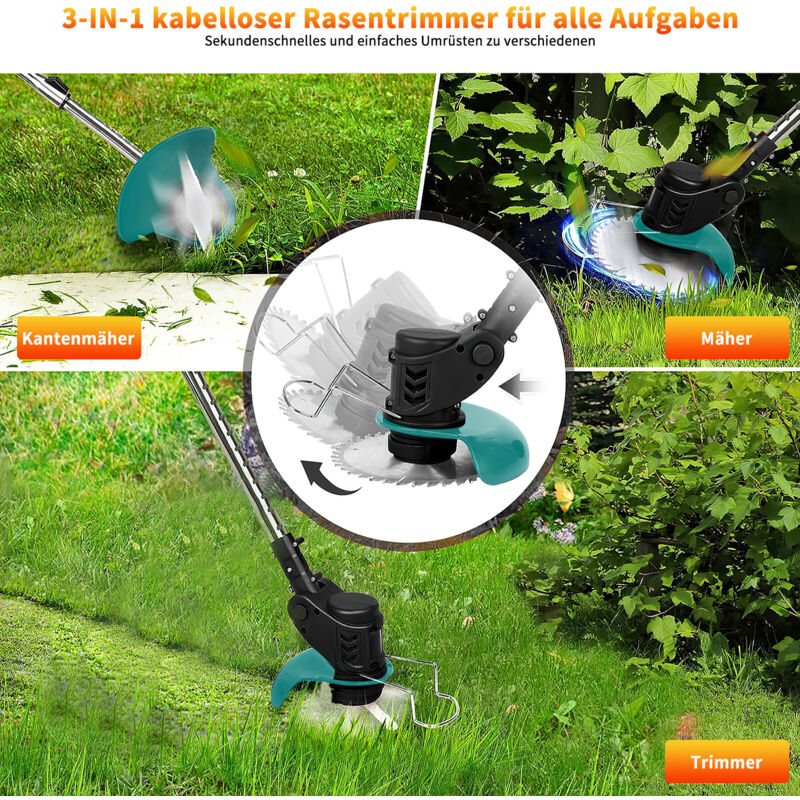 Endlich kabellos und flexibel im Garten arbeiten! Dieser praktische Akku-Rasentrimmer von QUIOTUIR macht Gartenschnitt zum Kinderspiel. Mit 3 verschiedenen Klingentypen für jede Aufgabe: Kunststoffklingen für Rasen, Legierungsklingen für Unkraut und Kreissägeblätter für Sträucher. Der 200W Motor bringt es auf stolze 18.000 U/min - da macht kein Gras eine Chance! Besonders praktisch: Er ist faltbar und höhenverstellbar (0,9-1,25m), passt sich also jeder Körpergröße an. Mit nur 1,8kg super leicht zu handhaben. Die 2 verstellbaren Räder sorgen für einfaches Führen. Im Lieferumfang ist alles dabei: 8 Klingen, Akku, Ladegerät, Schutzbrille, Handschuhe und Montagezubehör. Ladezeit nur 1 Stunde, Arbeitszeit 15-20 Minuten - perfekt für den normalen Hausgarten. Aus hochwertigen Materialien wie ABS, Legierungen und SK5-Stahl. Ideal für Gartenschnitt, Parkpflege, Obstgärten und mehr. Mach deine Gartenarbeit leichter und effizienter!