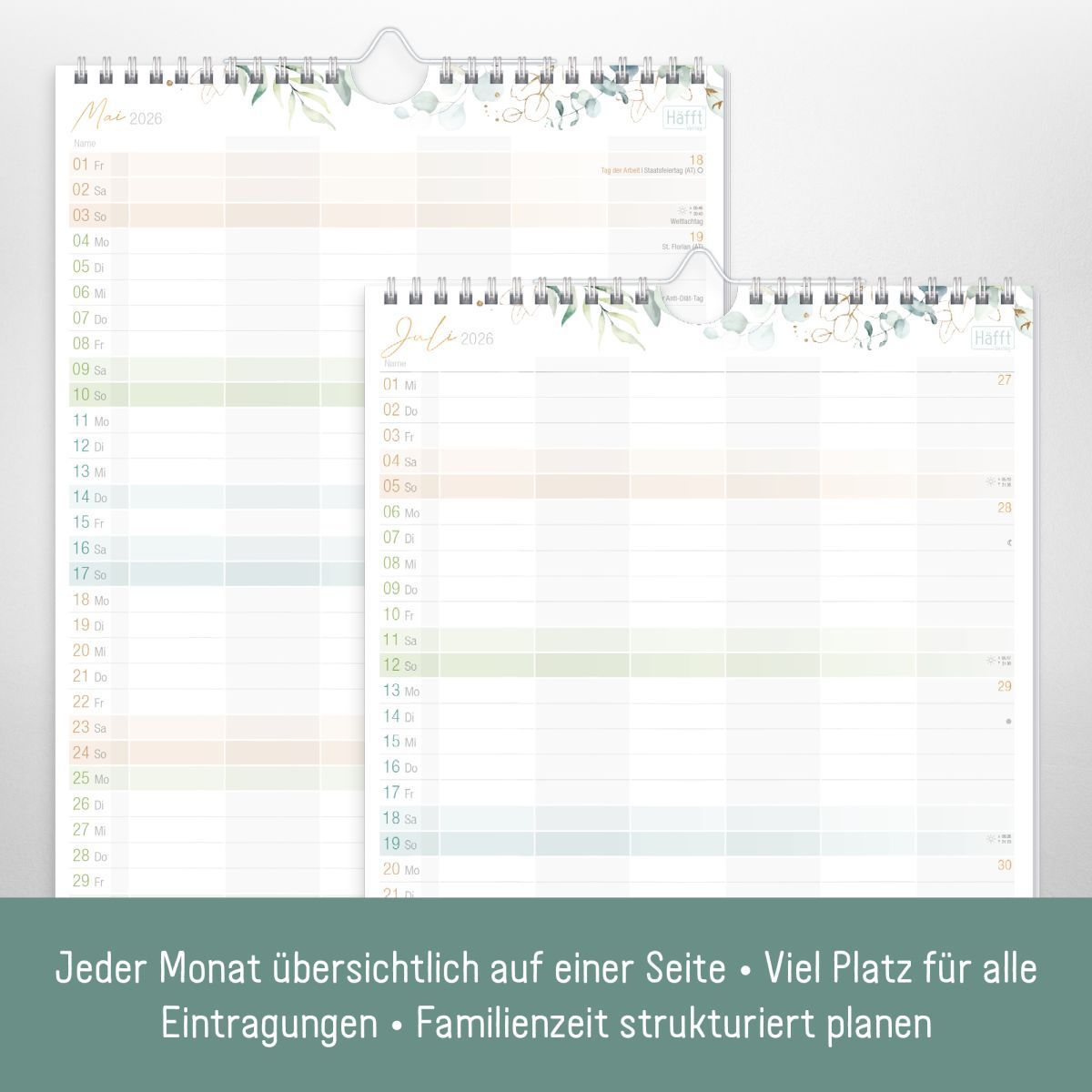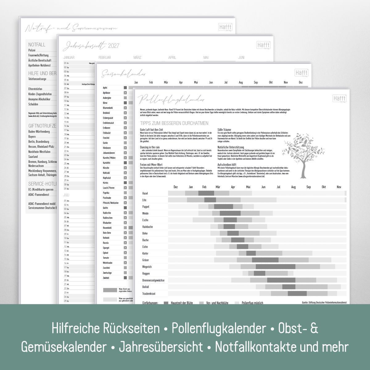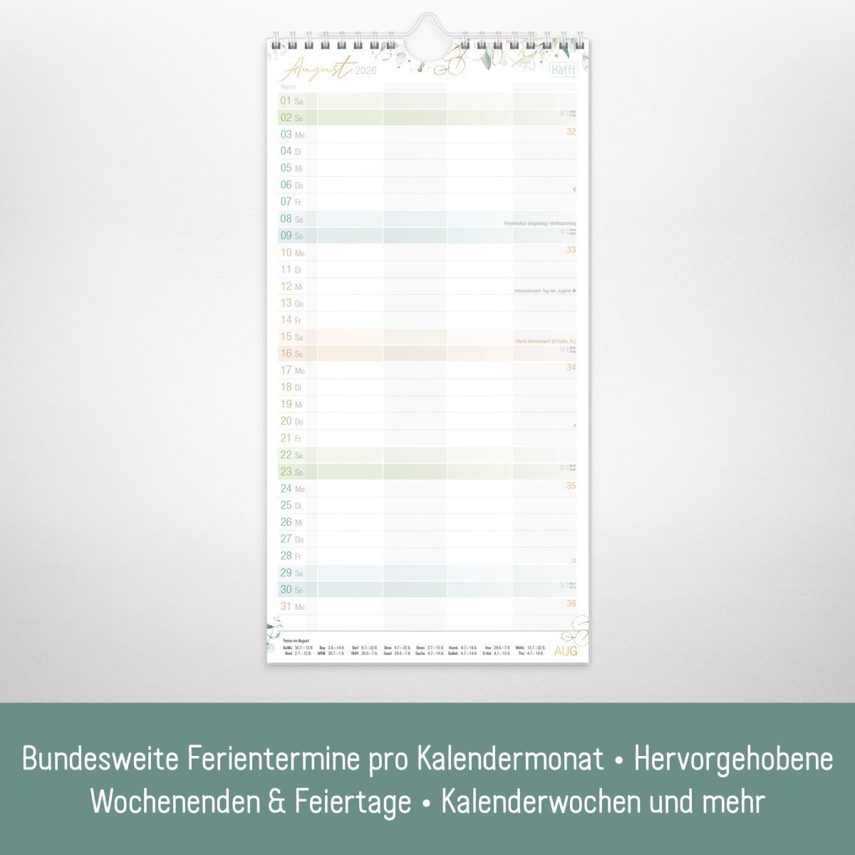 Endlich Ordnung im Familienchaos! Dieser Familienplaner 2026 hat Platz für bis zu 4 Personen - perfekt für Eltern und Kinder. Mit 16,5 x 32,5 cm ist er kompakt aber trotzdem super übersichtlich. Jeder Monat zeigt farbig getrennte Wochen, Feiertage und Schulferien aller Bundesländer. Besonders praktisch: Die Rückseiten mit Pollenflugkalender, Obst- und Gemüse-Saisonkalender und sogar einer Vorschau auf 2027. Das 140g/m² Papier ist robust und beschreibbar mit allen Stiften. FSC-zertifiziert und klimafreundlich gedruckt - gut für die Umwelt! Damit behältst du alle Termine im Blick: Geburtstage, Arzttermine, Schulveranstaltungen. Ein echter Lebensretter für jede Familie!