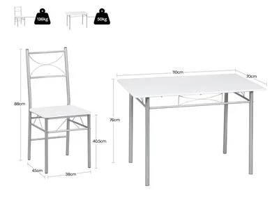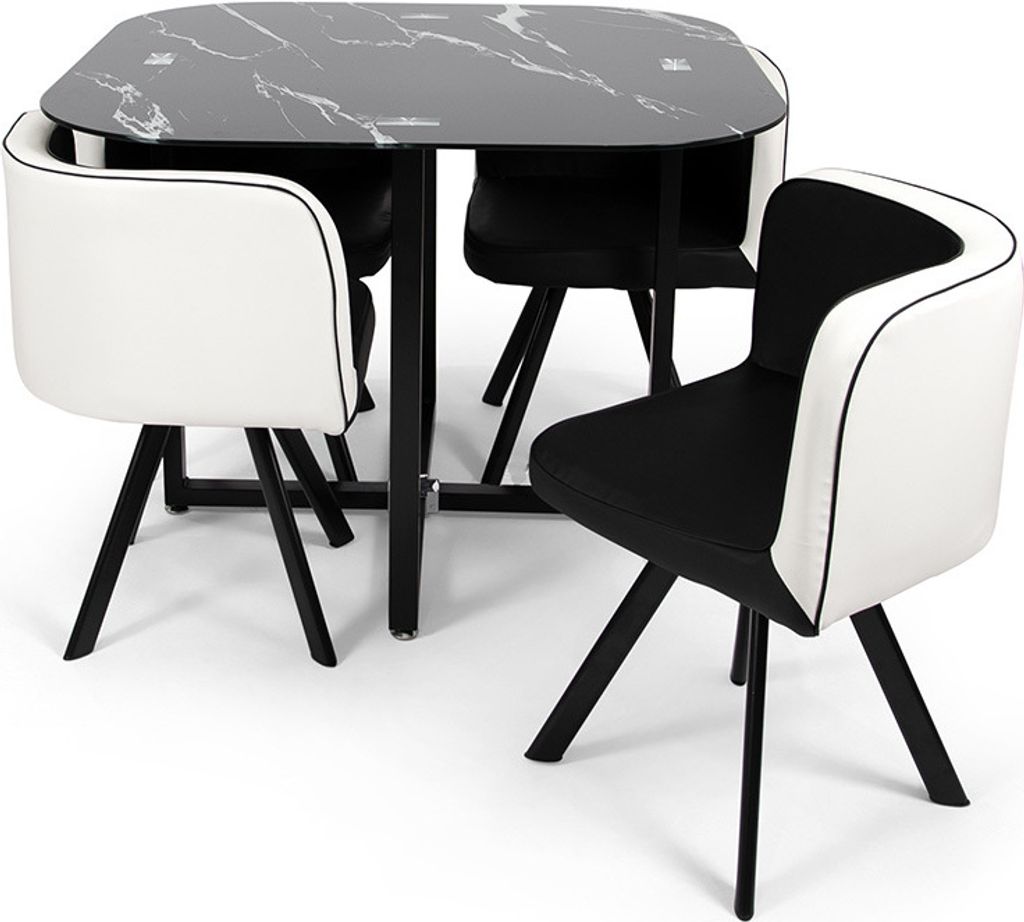Dieses wunderschöne Esszimmer-Set bringt Eleganz in dein Zuhause! Der runde Esstisch (100x100x73,5cm) aus gehärtetem Glas und Metall mit Marmor-Optik. Dazu 4 graue Stühle aus Polyester und Metall (65x54x69,5cm). Die abgerundeten Ecken sind besonders sicher. Kompakt und platzsparend - ideal für kleine Küchen oder Essbereiche. In strahlendem Weiß passt es zu jedem Einrichtungsstil. Einfach aufbauen und sofort gemütliche Abendessen mit Familie oder Freunden genießen. Stilvoll, praktisch und bezahlbar - was will man mehr?