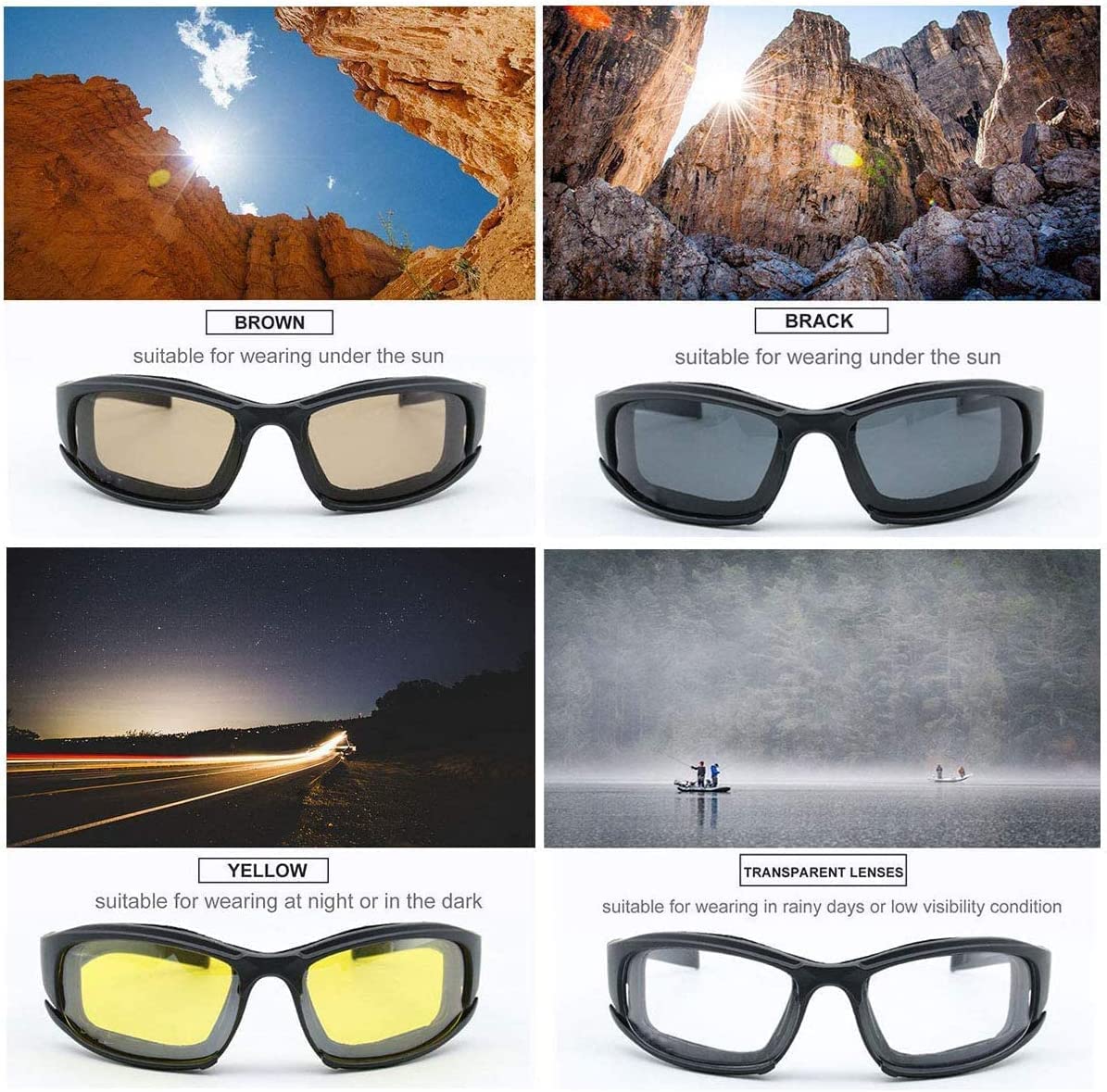 Das Besondere: Du bekommst gleich VIER verschiedene Gläser mitgeliefert! Schwarz für sonnige Tage, gelb für die Nacht, transparent für schlechtes Wetter und braun für wechselhafte Bedingungen. Einfach wechseln und du bist für jede Situation gewappnet!