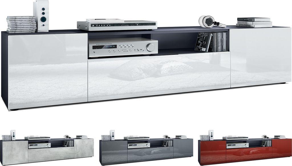 Hinter den zwei Türen verstecken sich geräumige, fast quadratische Fächer - perfekt für DVDs, Zeitschriften oder was du sonst so verstauen willst. In der Mitte gibt's eine schmale Klappe mit zwei weiteren Fächern und darüber einen offenen Bereich für Receiver, Spielkonsolen oder deine Hi-Fi-Anlage. So hast du alles im Blick und griffbereit!