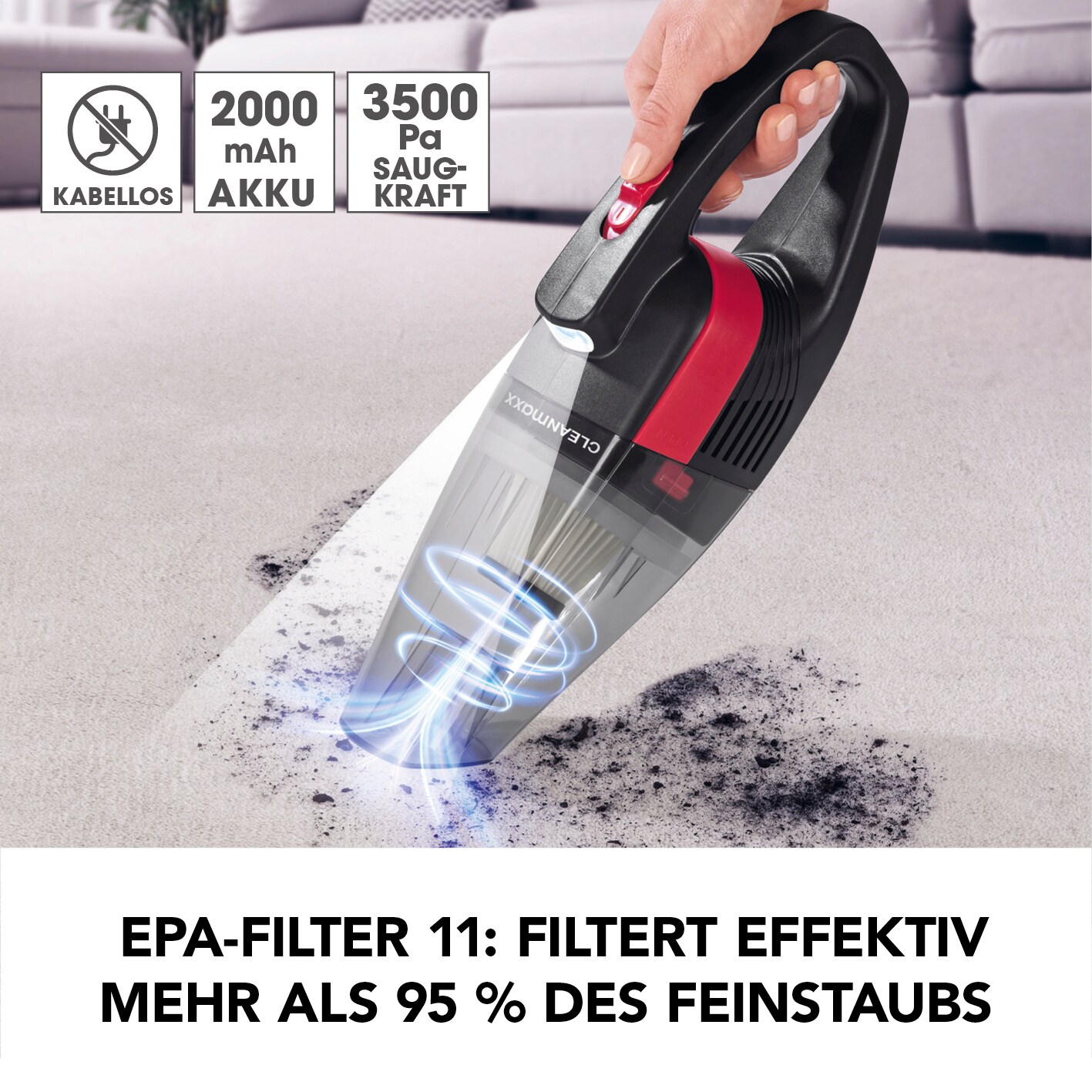 Mega praktisch dieser CLEANmaxx Handstaubsauger! Kabellos und super leicht - nur 0,33 kg. Damit saugst du überall wo's nervt: Im Auto, an der Tastatur, in Ritzen und Ecken. Und das Beste: Er kann nicht nur saugen, sondern auch blasen und vakuumieren! 20 Minuten Akkulaufzeit - mehr als genug für den Hausputz. Mit 1800 mAh Akku und 4 kPa Saugkraft - packt auch größeren Dreck. Aufladen per USB-C - einfach an Stecker, Powerbank oder Laptop. Im Set sind 7 Aufsätze dabei: Fugen-, Polster- und Gebläsedüsen, Bürsten und Vakuumieraufsatz. Damit wird Kleidung platzsparend verpackt! HEPA-Filter waschbar - immer frisch. Schmutzbehälter leicht zu entleeren - kein Gestöpsel. Perfekt für's Auto - Krümel adé! Auch für die Werkstatt, Boot, Camping oder Wohnmobil. Macht überall da sauber wo der große Staubsauger nicht hinkommt. Einfach in der Handhabung - auch für Technik-Muffel. Sieht schick aus und ist robust verarbeitet. Spart Zeit und Nerven - einfach schnell mal durchsaugen. Absolute Empfehlung für alle die Ordnung lieben! Hol dir diesen Alleskönner - du wirst ihn lieben!