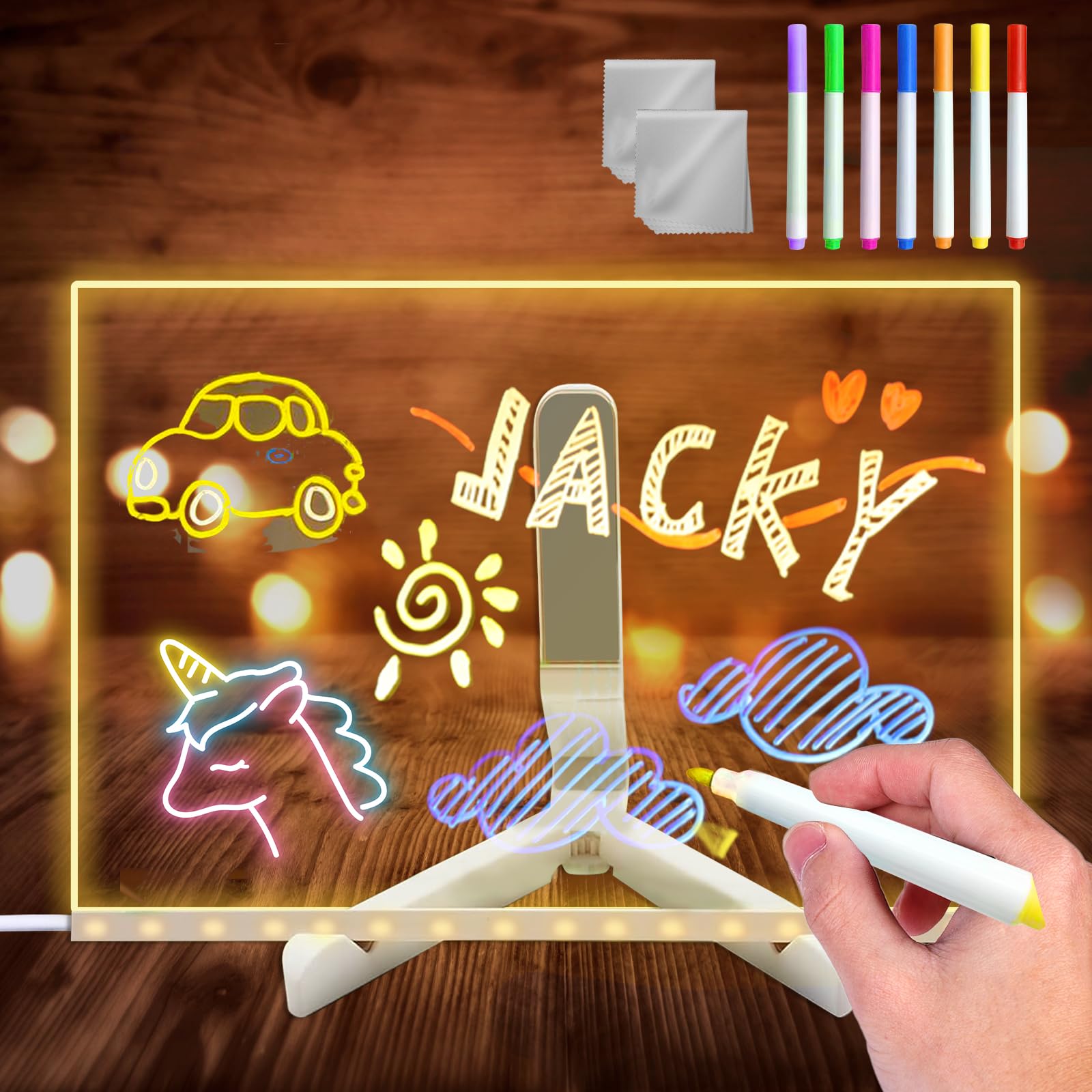 Die Tafel leuchtet in warmem LED-Licht und macht das Malen zum besonderen Erlebnis. Einfach malen, bewundern und mit einem Tuch abwischen - schon kann's von vorne losgehen! Ob als Spielzeug, Doodle-Board oder Notiztafel - hier ist Kreativität ohne Ende angesagt!