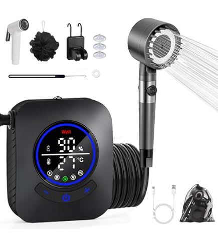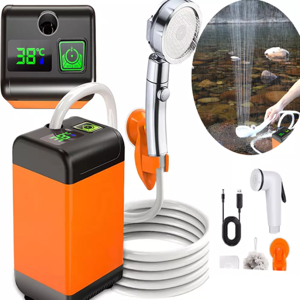 Endlich duschen wo immer du willst! Die Zaxiva tragbare Campingdusche mit integriertem 6000mAh Akku gibt dir völlige Freiheit. Mit 4 Wasserströmen zur Auswahl: weich, normal, elektrisch und Lanze (nach Entfernen des Duschkopfes). Das smarte LCD-Display zeigt dir in Echtzeit den Batteriestatus und die Wassertemperatur an (0-60°C). Eine Ladung reicht für 60-90 Minuten Dauerbetrieb - aufladbar per USB-C mit Handy-Ladegerät, Laptop oder Auto-USB. Die PP-Filterelemente entfernen Verunreinigungen aus dem Wasser, ideal für empfindliche Haut. Perfekt für Camping, Wandern, Gartenarbeit, Autowäsche, Strandausflüge oder zum Waschen deiner Haustiere. Leicht und kompakt - passt in jeden Rucksack. Auch super als Solarduschen-Ersatz! Einfach den Wassertank befüllen, einschalten und duschen - völlig unabhängig von Steckdosen und Wasseranschlüssen.