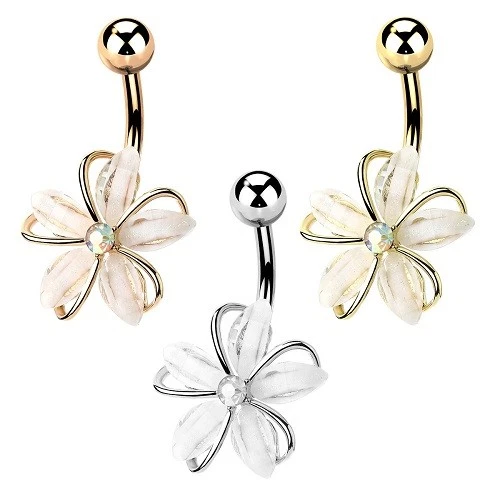 Erhältlich in verschiedenen Stablängen (6mm oder 8mm) und in silber, gold oder rosegold. Die Blume hat 7,9mm Durchmesser - auffällig aber nicht übertrieben. Einfach durch den Stichkanal führen und die Verschlussplatte anschrauben - fertig!