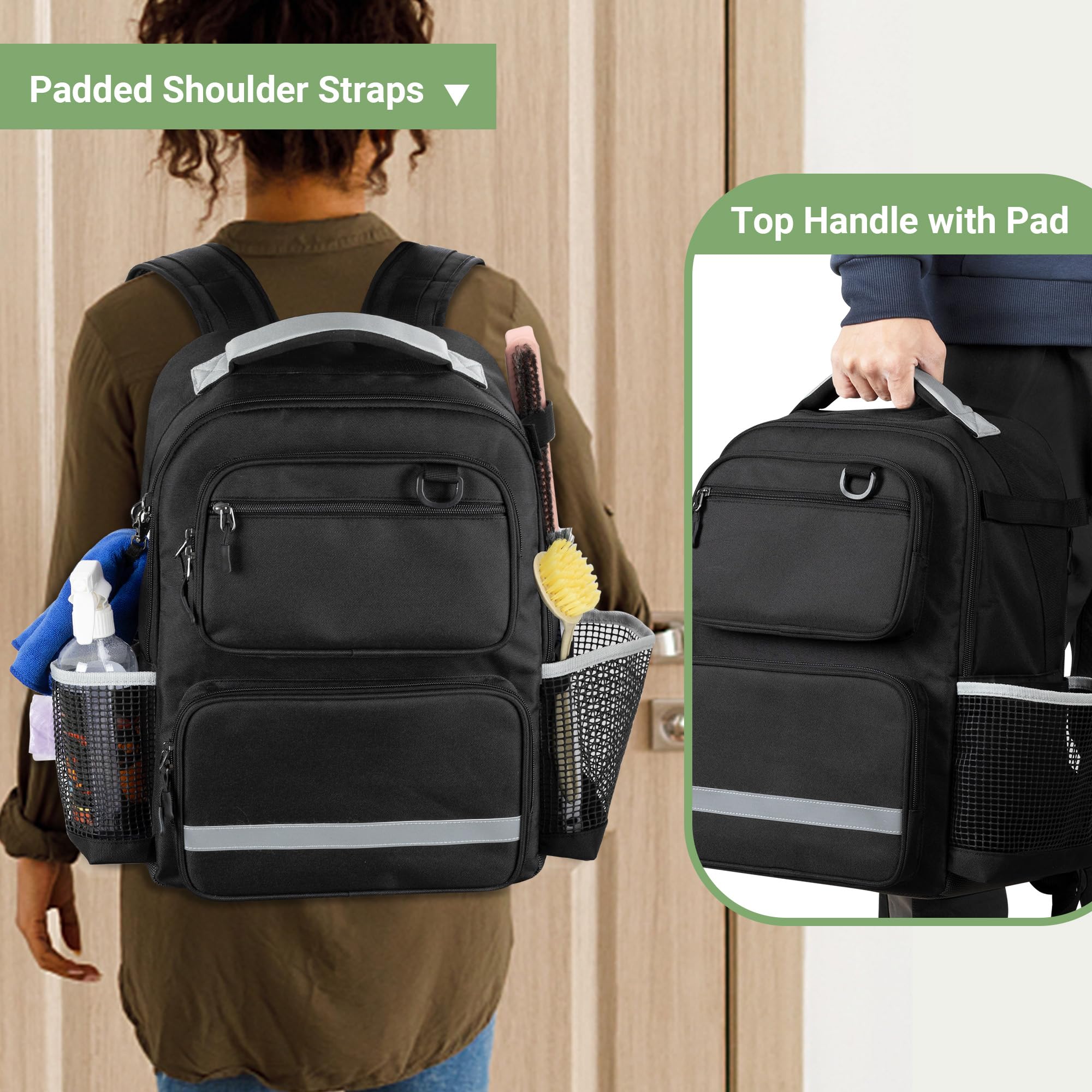 Endlich Ordnung für deine Putzutensilien! Dieser Reinigungsrucksack hat alles was du brauchst: Eine stabile Bodenplatte damit er nicht umkippt, wasserdichter Boden und unzählige Taschen für Bürsten, Lappen, Sprays und Co. Maße: 31,8 x 19,1 x 43,2 cm - genug Platz für dein ganzes Reinigungszeug. Vorne Reißverschlussfächer, seitlich Netztaschen, hinten eine extra Tasche und sogar eine separate für Müllbeutel. Der reflektierende Streifen sorgt für Sichtbarkeit bei schlechtem Licht. Rückenpolster und gepolsterte Tragegurte machen das Tragen super bequem - Hände frei für andere Dinge! Aus robustem Material das lange hält. Perfekt für Putzkräfte, Hausmeister oder auch für den Haushalt. Kann auch als Werkzeugrucksack verwendet werden. Einfach alles reinpacken und los geht's zur nächsten Reinigungsaktion!