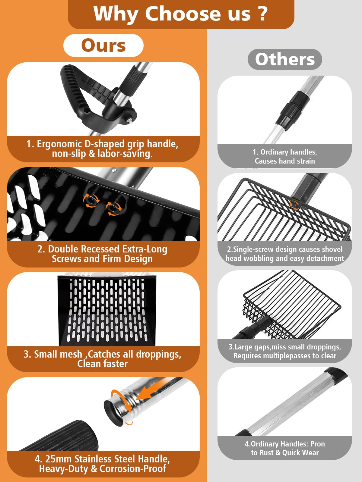 Endlich rückenschonend den Hühnerstall reinigen! Diese Schaufel hat nen verstellbaren D-Griff von 95-163cm - musst dich nicht mehr bücken. Aus rostfreiem Edelstahl, super stabil mit doppelt gesicherten Schrauben. Der 25cm gebogene Kopf mit Siebgitter (2cm Maschen) siebt perfekt Einstreu aus. Macht mehr Fläche pro Schaufel - geht schneller! Einfach in 2-3 Minuten montiert, leicht zu reinigen. Perfekt für Hühnerstall, Katzenklo, Pferdestall oder Garten. Dein Rücken wird's dir danken!