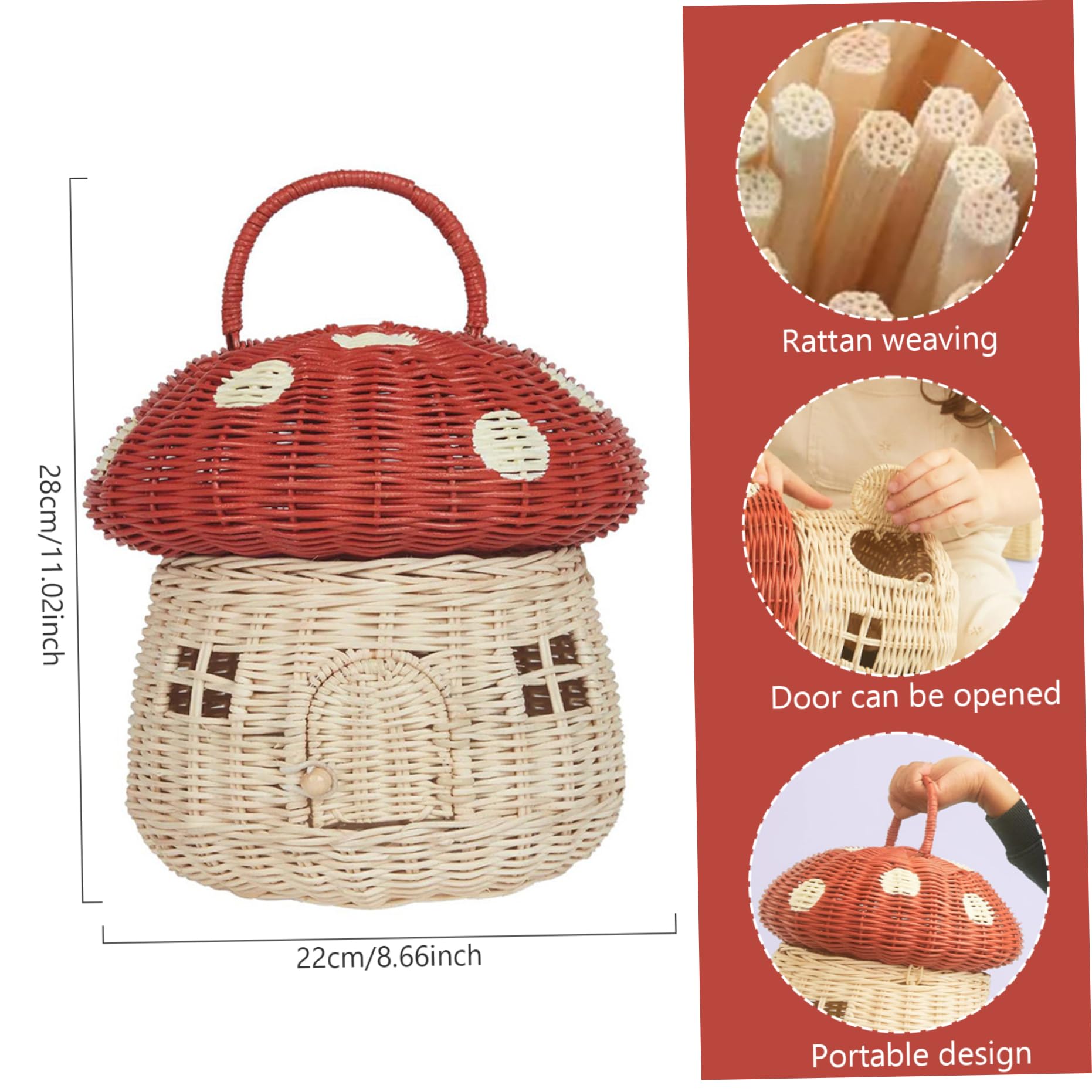 Wie süß ist denn dieser Pilzkorb aus Rattan? Mit seinem niedlichen Design, zwei kleinen Fenstern und einer Öffnungstür bringt er sofort gute Laune in dein Zuhause. Aus natürlichem Rattan gefertigt, ist er nicht nur umweltfreundlich, sondern auch super stabil. Mit praktischem Deckel und Griff kannst du ihn easy tragen und überall verwenden - ob als Aufbewahrung für Süßigkeiten, Spielzeug, Eier oder andere Kleinigkeiten. Maße: ca. 28x24cm (Durchmesser x Höhe), also groß genug für die meisten Dinge, aber nicht zu sperrig. Perfekt für Ostern, Geburtstage, Weihnachten oder einfach als Deko im Wohnzimmer, Flur oder Kinderzimmer. Aber er kann mehr als nur hübsch aussehen - nimm ihn mit zum Picknick, Einkaufen, Strand oder Camping! Ein vielseitiger Korb, der nicht nur gut aussieht, sondern auch praktisch ist. Mach dein Zuhause ein bisschen märchenhafter mit diesem charmanten Pilzkorb!