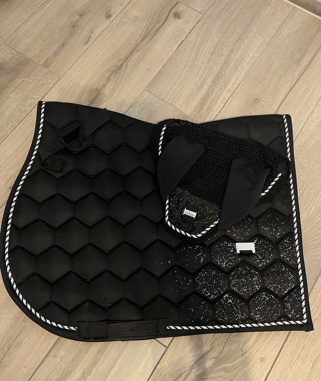 Wow, diese Dressur-Schabracke von Wagner ist ja mal richtig schick! In blau-weiß mit funkelnden Strass-Steinen - da macht dein Pferd auf dem Turnier richtig was her. Super bequem fürs Pferd, die Fliegenhaube schützt zusätzlich vor lästigen Insekten. Perfekt für Dressurprüfungen, aber auch fürs tägliche Training. Die Verarbeitung ist typisch Wagner - einfach top Qualität. Sieht nicht nur gut aus, sondern sitzt auch perfekt. Dein Pferd wird sich wie ein Champion fühlen! Ob für Profis oder Hobbyreiter - mit dieser Schabracke bist du bestens ausgestattet. Und die Strass-Steine glitzern so schön in der Sonne - einfach ein Hingucker! Einfach über den Sattel legen und schon kann's losgehen. Für alle, die ihrem Pferd was Besonderes gönnen wollen und dabei auf Qualität und Style Wert legen.