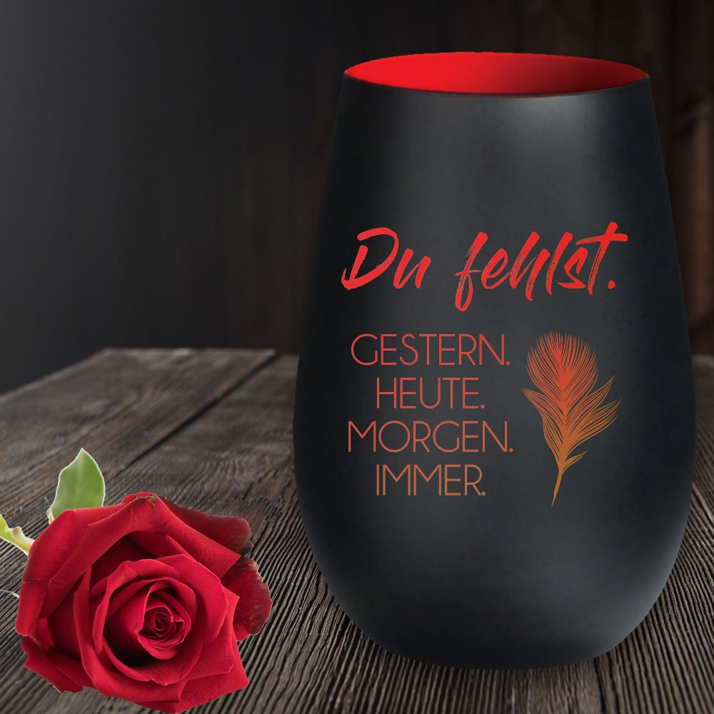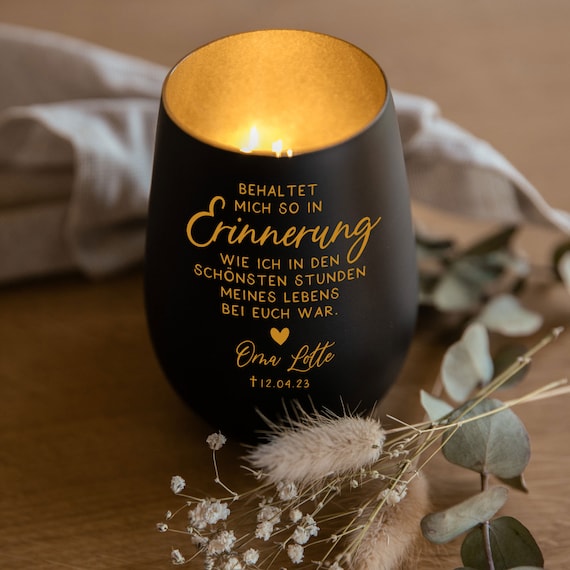 Ein wunderschönes Andenken an deinen treuen Begleiter! Dieses personalisierte Trauerlicht hilft dir, in Würde Abschied zu nehmen und die schönen Erinnerungen an deinen Hund wachzuhalten. Aus hochwertigem Kristallglas gefertigt und mit einer liebevollen Gravur deines Wunschtextes und Datums versehen. Sobald ein Teelicht im Glas brennt, scheint das warme Licht durch die Gravur und schafft eine tröstliche Atmosphäre. Erhältlich in Schwarz mit goldener Innenseite oder Weiß mit silberner Innenseite. Mit 12 cm Höhe und 8,5 cm Durchmesser ist es ein dezenter und doch wirkungsvoller Blickfang. Verschiedene Motive und Gedenktexte stehen zur Auswahl. Ein einfühlsames Geschenk für trauernde Tierbesitzer oder für dich selbst, um deinem geliebten Hund zu gedenken.