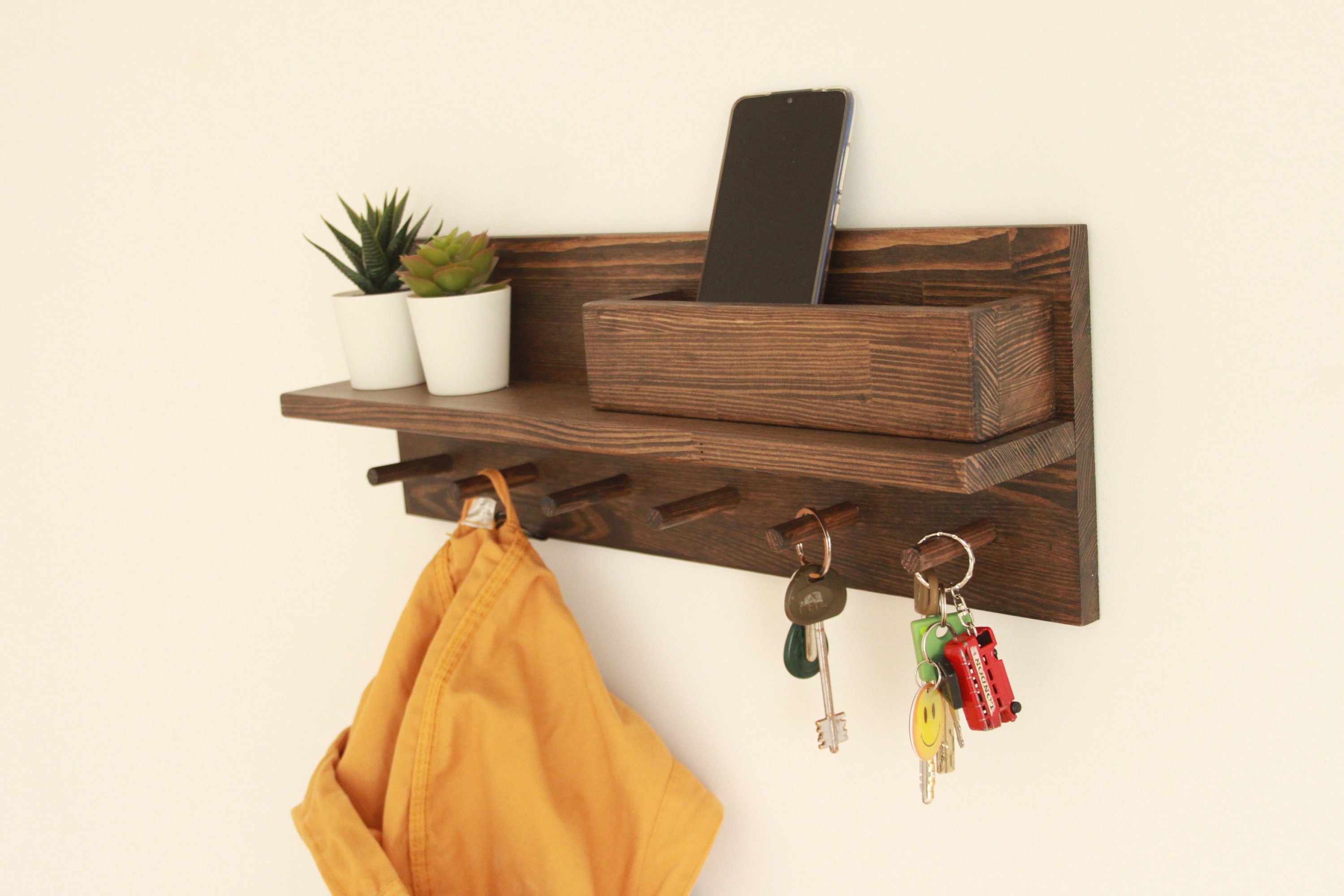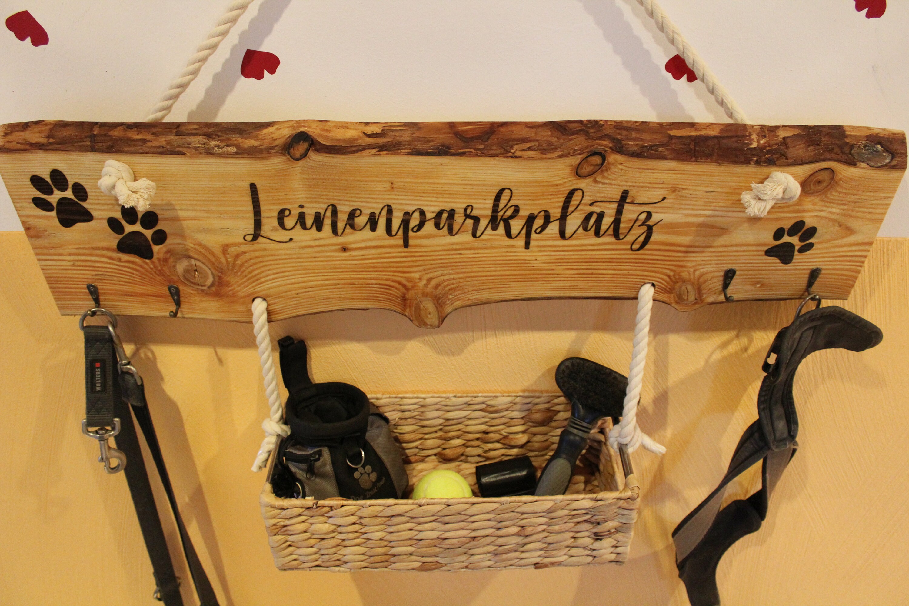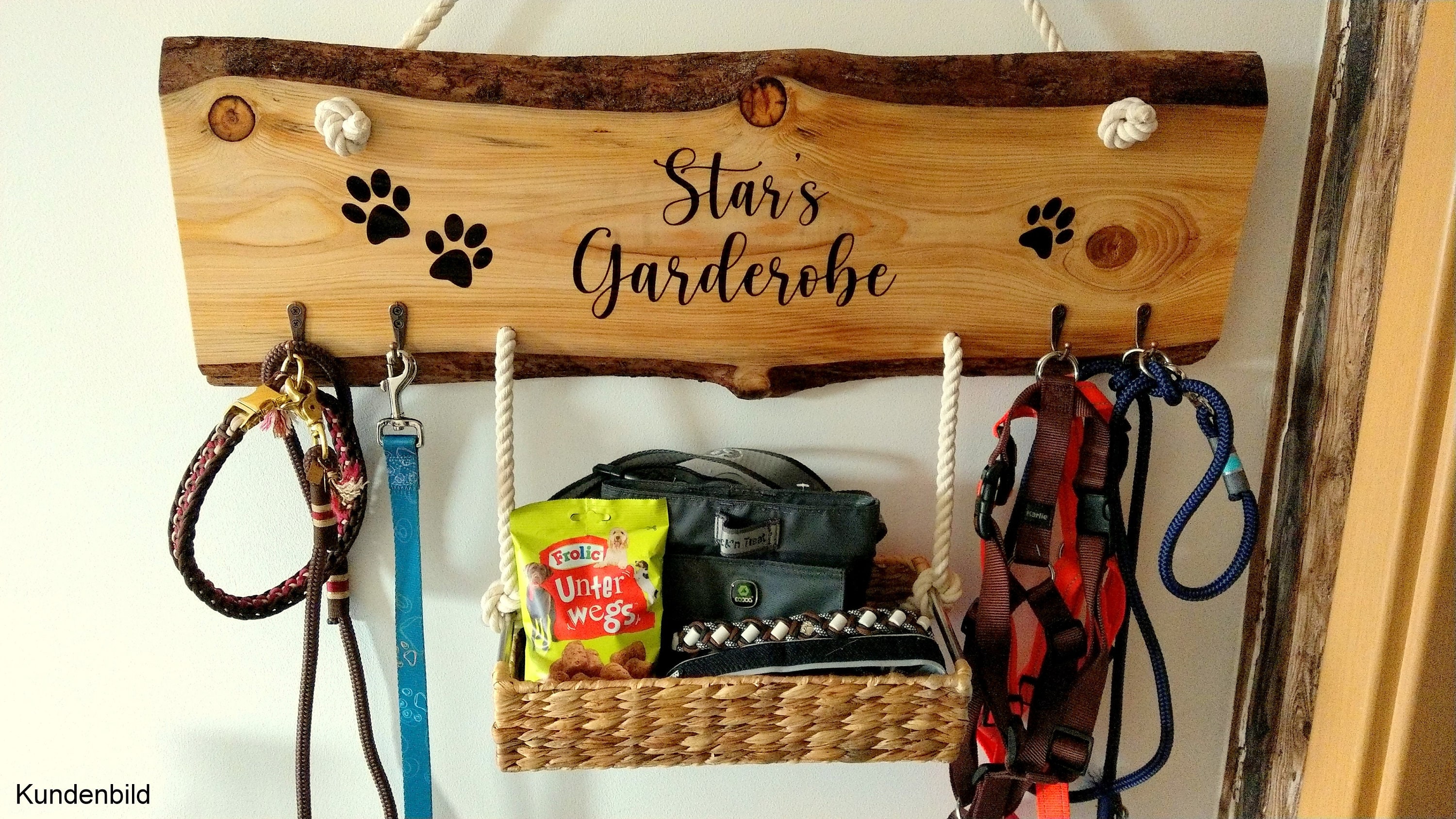 Endlich Ordnung für all die Hundesachen! Diese niedliche Hunde-Garderobe aus Buchenholz bringt System in deinen Flur. Mit den Maßen 16x16cm ist sie kompakt aber praktisch, verziert mit süßen Pfotenabdruck-Motiven. Die handgeschliffenen Kanten sind sicher für Kinderhände und Hundepfoten. Hergestellt mit wasserbasierten Farbstoffen ist sie umweltfreundlich und alterungsbeständig, selbst bei Feuchtigkeit. Perfekt um Leinen, Kotbeutel, Halsbänder oder Signalwesten griffbereit zu haben. Mit dem Aufhänger auf der Rückseite einfach an die Wand zu bringen - ob im Flur, in der Garage, am Eingang oder auf dem Balkon. Sieht nicht nur hübsch aus, sondern sorgt auch für mehr Ordnung im Alltag mit Hund. Ein praktisches und dekoratives Accessoire für jeden Hundehaushalt, das zeigt: Hier wohnt ein treuer Freund!