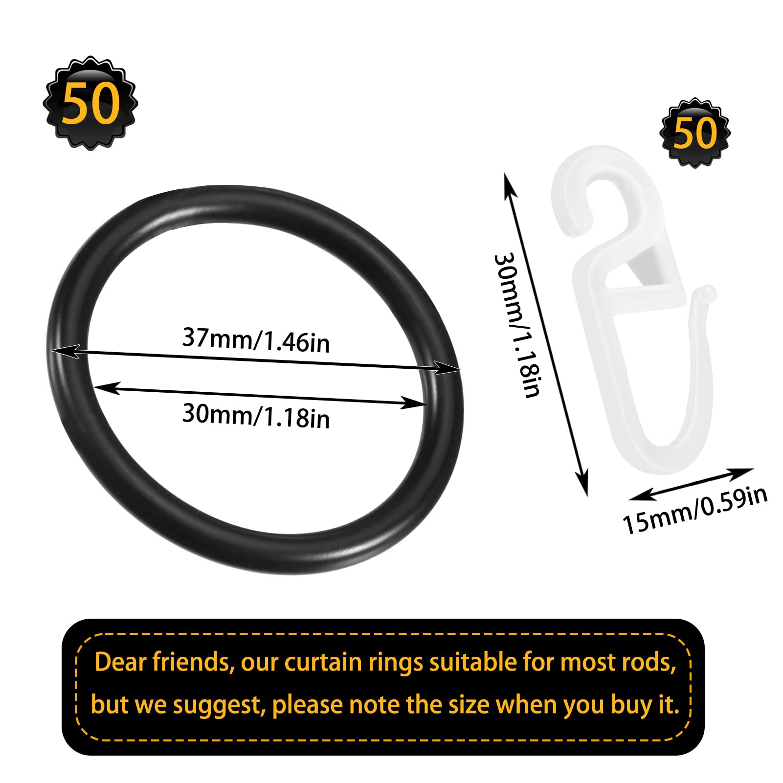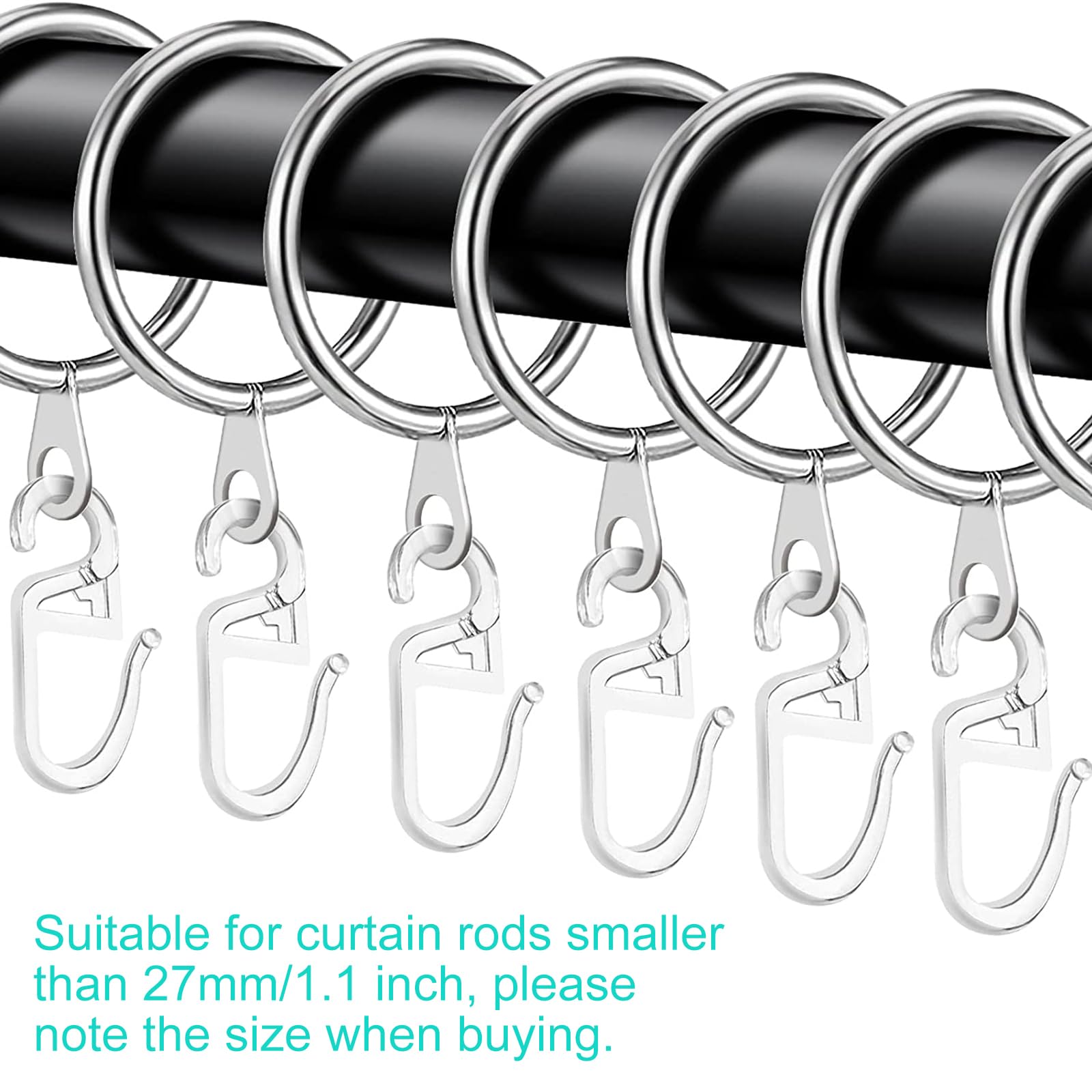 Endlich störungsfreies Vorhanggleiten! Dieses 50-teilige Set enthält Vorhangringe aus Metall und weiße Kunststoff-Haken. Innendurchmesser 30 mm - passt für Gardinenstangen bis 27 mm. Jeder Ring trägt bis zu 3 Pfund und ist rostfrei beschichtet. Einfache Installation: Ringe auf die Stange fädeln, Haken daran befestigen. Glatte Oberfläche - keine Kratzer, kein Einklemmen der Vorhangschnur. Ideal für Duschvorhänge, Gardinen und raumhohe Vorhänge. Perfekt für Küche, Bad, Wohnzimmer - überall wo Vorhänge schön gleiten sollen. Ausreichend für mehrere Vorhänge oder zum Austausch alter, quietschender Ringe. Mach deine Vorhänge wieder flott!
