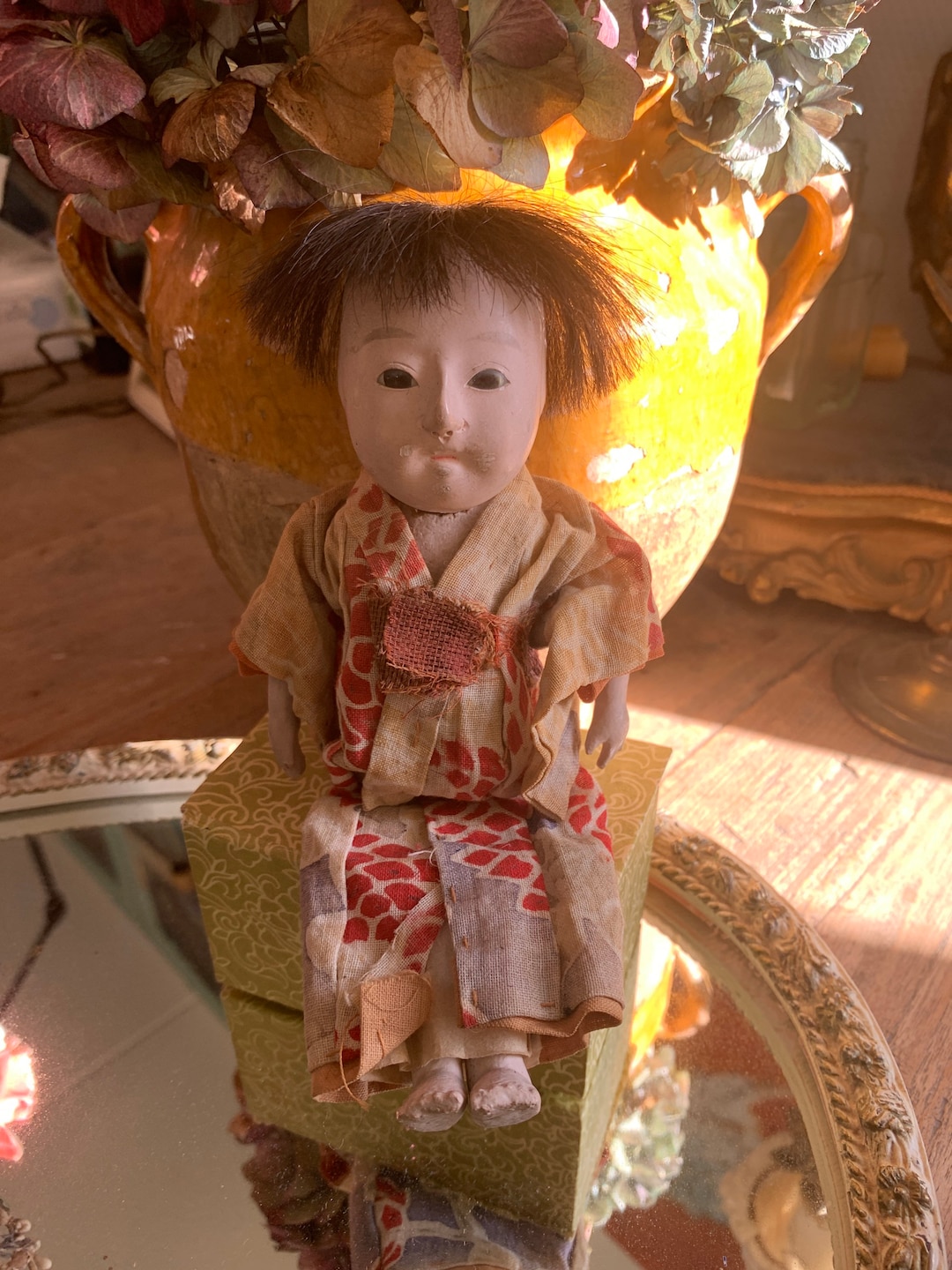 Hergestellt aus hochwertigen Materialien: Der Körper aus Gips, die Hände aus Kunstharz und die Kleidung aus feinster Seide. Die kunstvolle Perücke aus Kunstseide wurde manuell frisiert und mit Silber- und Goldfäden verziert.