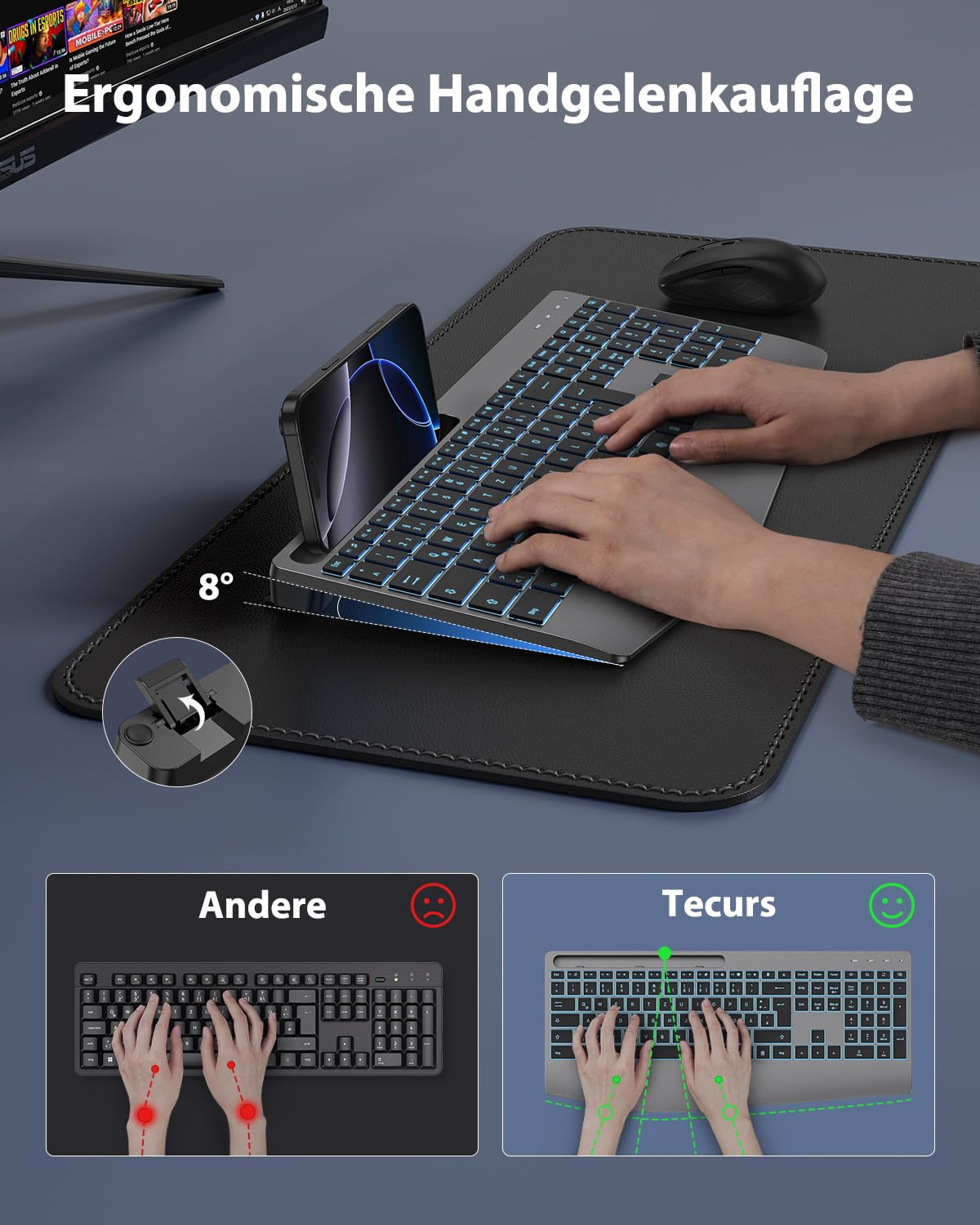 Endlich bequem tippen! Diese kabellose Tastatur mit extra langer Handballenauflage entlastet deine Handgelenke spürbar - perfekt für lange Arbeitstage am PC. Mit 7 verschiedenen Beleuchtungsfarben und 3 Helligkeitsstufen siehst du auch im Dunkeln jede Taste. Die 2,4 GHz Verbindung ist super stabil und der integrierte 1000 mAh Akku hält bis zu 30 Tage! Besonders praktisch: Die handyhalterung oben drauf - so verpasst du keine wichtigen Nachrichten. Die Tasten sind angenehm leise (95% weniger Geräusche) und stören nicht in Meetings oder wenn andere schlafen. Mit Microsoft Copilot-Taste für Windows 11 und 12 Multimedia-Tasten arbeitest du effizienter. Einfach per USB-A oder Type-C aufladen und loslegen - keine Treiber nötig! Perfekt für Homeoffice, Studenten oder alle, die viel am Computer arbeiten.