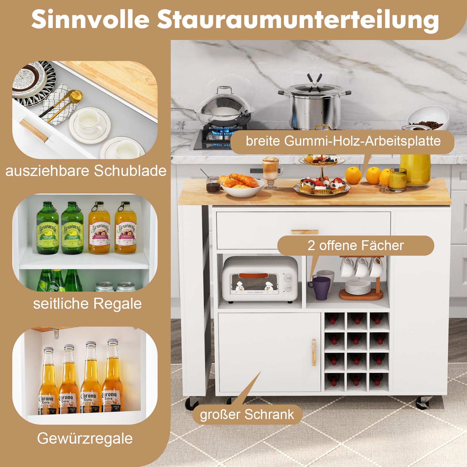 Wow, diese Kücheninsel hat alles was du brauchst - und noch mehr! Mit extra Haustierbereich wo dein Hund oder deine Katze gemütlich liegen kann während du kochst. Praktische Schubladen für Besteck, verstellbare Regale für Töpfe und Küchengeräte, und ein cooles Gewürzregal das endlich Ordnung in deine Gewürze bringt. Die weiße Front mit schwarzer Marmorplatte sieht super modern aus. Perfekt für Küche, Wohnzimmer oder als Servierwagen bei Partys. Maße: 120x60x90 cm - genug Platz für alles was in der Küche so anfällt. Dein neuer Lieblingsplatz in der Küche!