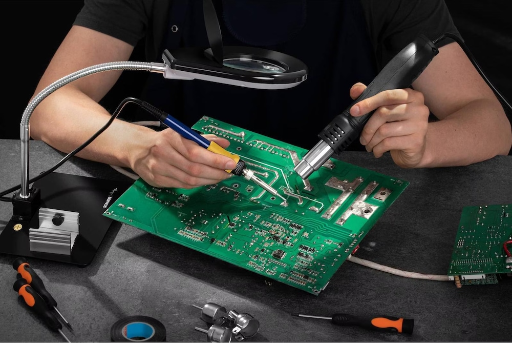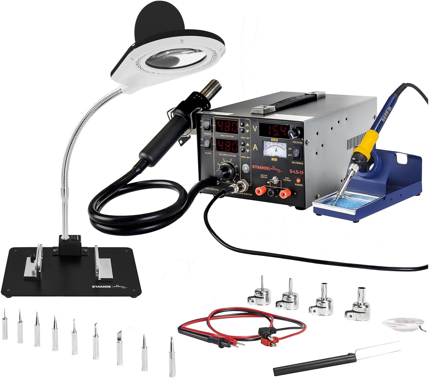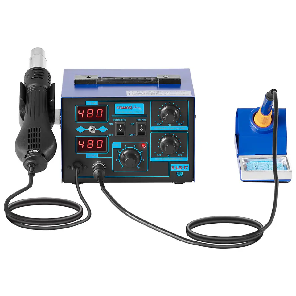 Für alle, die gerne löten und reparieren! Die Stamos S-LS-17 Lötstation ist ein echtes Allround-Talent für deine Werkstatt. Mit 75W Lötkolben und 650W Heißluftfunktion meisterst du jede Aufgabe - ob Leiterplatten, Verzinnungen oder Metallteile. Temperatur bis 480°C einstellbar und super präzise mit ±1°C Abweichung beim Lötkolben. Die integrierte Lupenleuchte mit 5x/10x Vergrößerung und 40 LEDs macht selbst feinste Arbeiten zum Kinderspiel. Im Lieferumfang ist alles dabei, was du brauchst: 9 Lötspitzen, 4 Heißluftdüsen, Entlötlitze, Pinzette und mehr. Einfache Bedienung und professionelle Ergebnisse garantiert! Perfekt für Elektronik-Begeisterte, Hobby-Bastler und Profis. Mit 230V Anschluss sofort einsatzbereit. Hol dir jetzt das Komplett-Set für alle Löt- und Reparaturarbeiten - damit macht werken richtig Spaß!