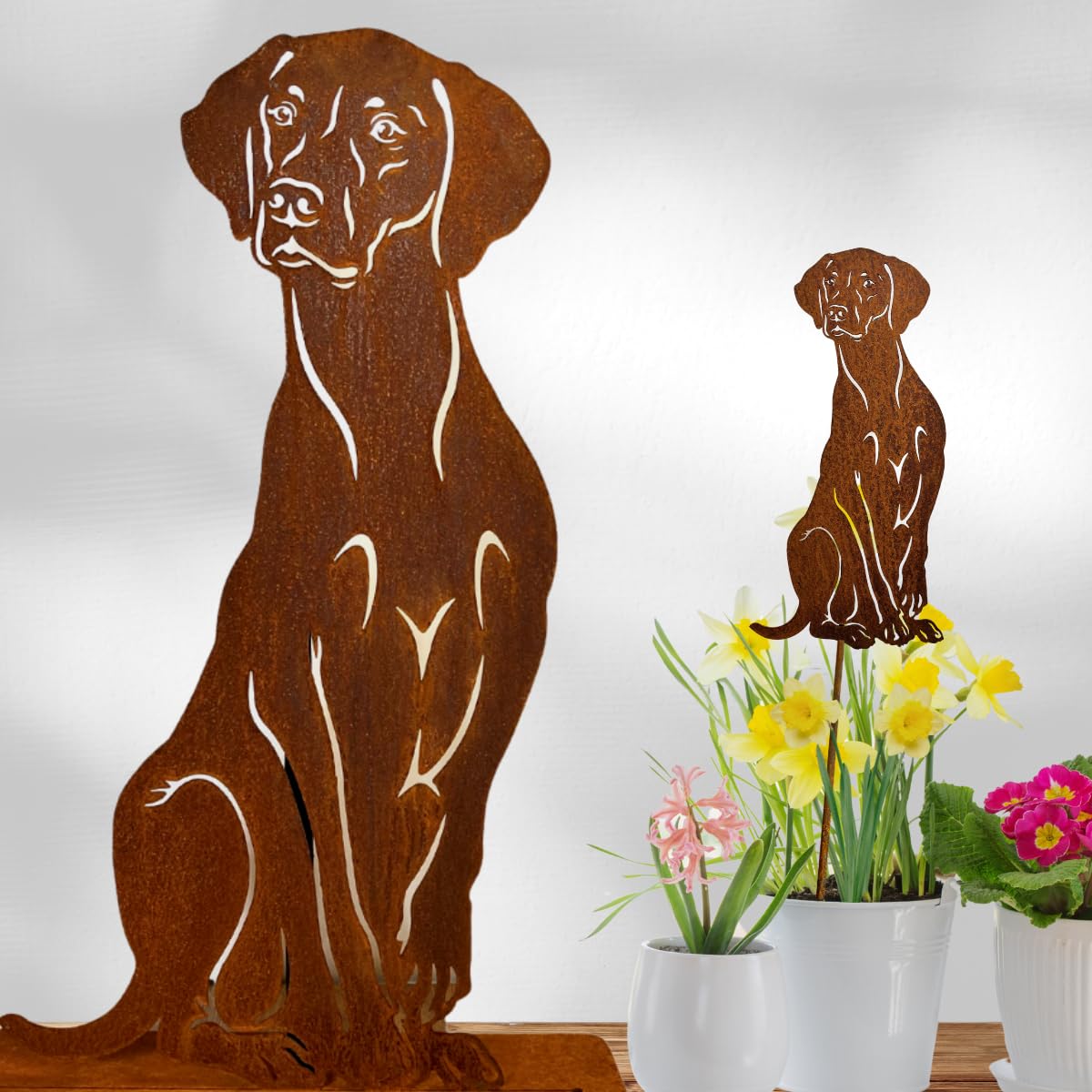 Wie süß ist das denn? Dieser Gartenpfahl in Hunde-Pfoten-Form mit Herz ist einfach mal was ganz Anderes! Mit 51cm Höhe und 29,5cm Breite macht er was her in deinem Garten oder auf dem Balkon. Die antike Rost-Optik sieht total authentisch aus - wie ein Fundstück aus Omas Garten! Aber keine Sorge, das Eisen ist wetterbeständig und hält Regen und Sonne problemlos stand. Du kannst den Pfahl super in Blumenbeete stecken, um Kletterpflanzen zu führen, oder ihn als niedliche Wegmarkierung aufstellen. Aber er sieht auch innen super aus - als Deko an der Wand oder im Flur. Für alle Tierliebhaber und Garten-Fans ist das ein absolutes Must-Have! Der Erdspieß lässt sich leicht in die Erde stecken und bleibt stabil stehen. Das Design mit den Pfoten und dem Herz ist einfach liebevoll gemacht und bringt sofort gute Laune. Egal ob im Cottage-Garten, im modernen Stadtgarten oder auf der Terrasse - dieser Pfahl passt überall und ist immer ein Eyecatcher! Und das beste: Er sieht mit der Zeit sogar noch besser aus, wenn er natürlich patiniert. Einfach in die Erde stecken und sich über die vielen neidischen Blicke der Nachbarn freuen!