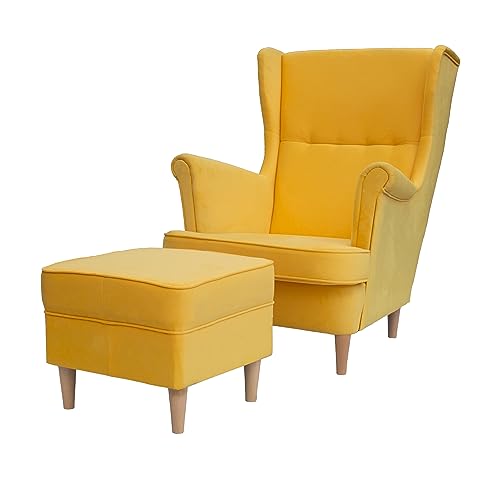 Oh wow, was für ein gemütlicher Sessel! Dieser Ohrensessel im Landhaus-Stil wird dein neuer Lieblingsplatz. Inklusive passendem Hocker und Zierkissen im Cord-Bezug Gold/Ocker - einfach traumhaft! Maße: 90x98x76 cm, Sitzhöhe 42 cm - perfekt zum Relaxen. Die Wellenunterfederung sorgt für himmlischen Sitzkomfort - wie auf Wolken sitzen! Die schwarzen Echtholz-Füße geben dem Ganzen einen eleganten Touch. Belastbar bis 125 kg, also für die meisten Menschen ideal. Perfekt fürs Lesen, Fernsehen oder einfach nur zum Träumen. Der Hocker (50x42x50 cm) macht das Relax-Erlebnis komplett - Füße hoch und abschalten! Verschiedene Bezugsstoffe verfügbar - bei Interesse einfach nach Stoffmustern fragen. Super Preis für so ein Qualitätsstück! Wird zerlegt geliefert, Aufbau aber machbar. Optional Montageservice verfügbar. Mach dir deine eigene Wohlfühl-Oase - dieser Sessel lädt zum Verweilen ein!