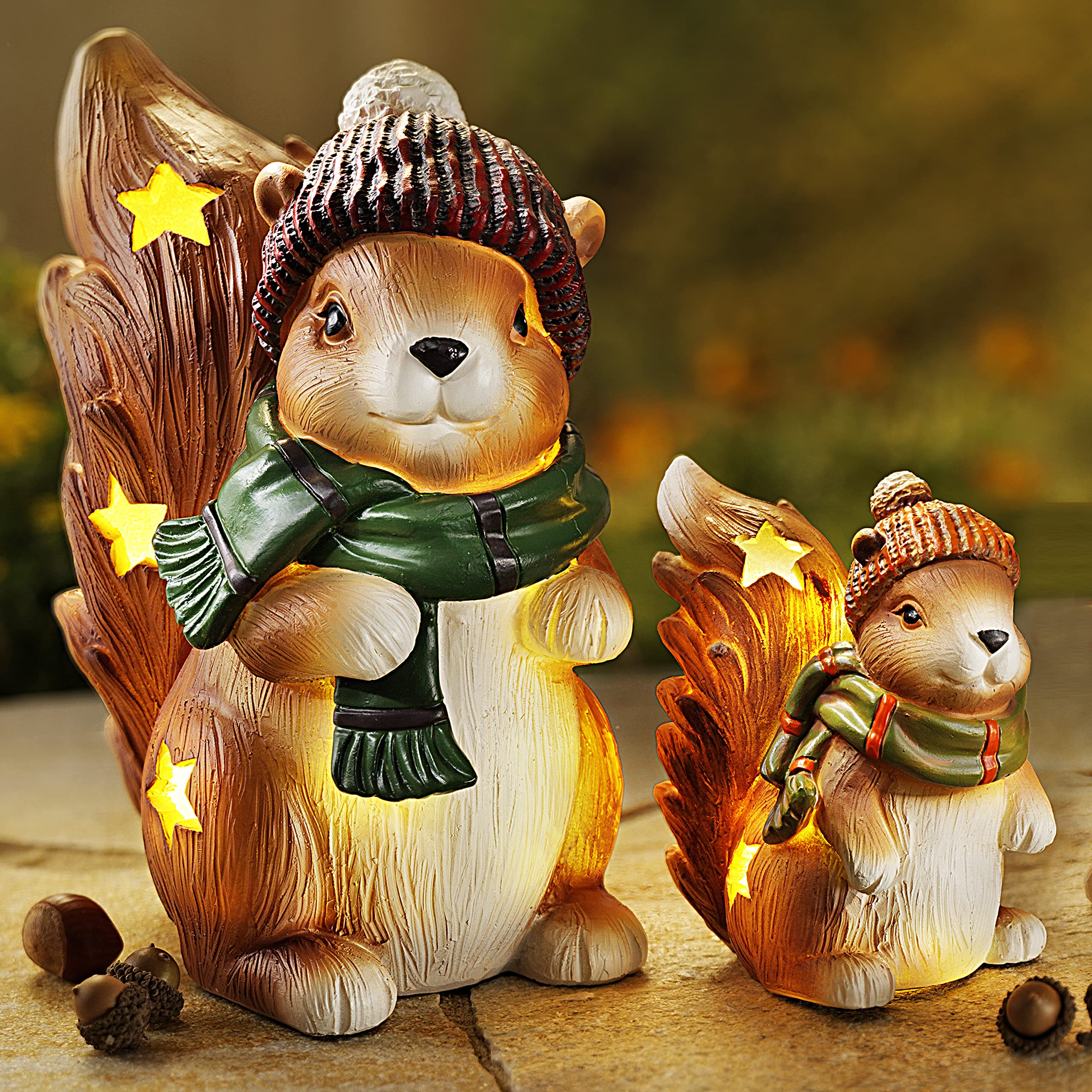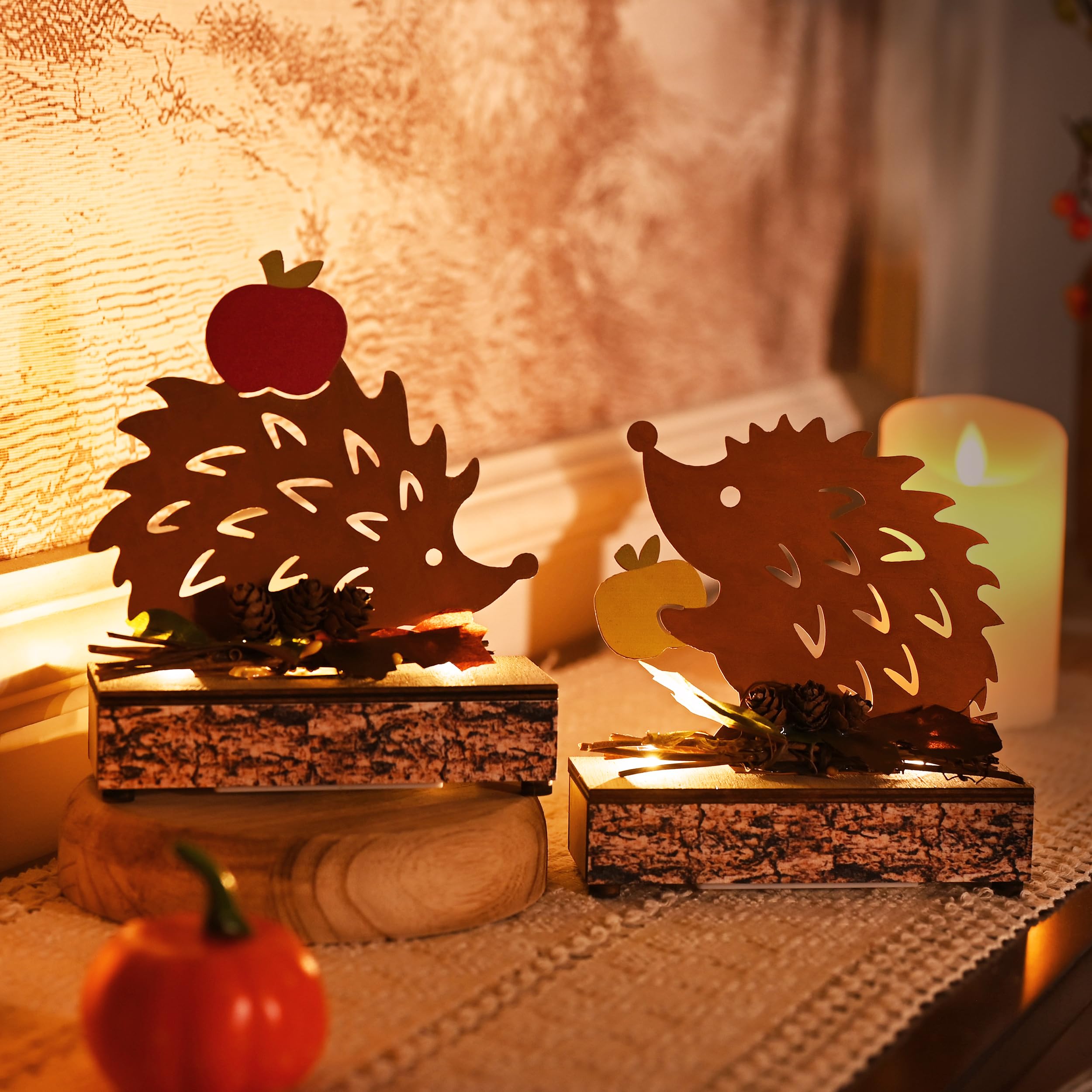 Gemütliche Herbststimmung für dein Zuhause! Diese süßen LED-Deko-Figuren mit Igel und Eichhörnchen in trendiger Rostoptik bringen sofort herbstliches Flair in deine vier Wände. Jede Figur ist etwa 14x14cm groß und zeigt liebevolle Details wie Tannenzapfen, Ahornblätter und die niedlichen Tiere des Waldes. Das besondere: Die Figuren leuchten in warmem LED-Licht und haben einen praktischen Timer - sie gehen also jeden Abend zur gleichen Zeit an und aus, ohne dass du daran denken musst. Hergestellt aus langlebigem Eisen und Holz, wirken sie durch den Rost-Look besonders authentisch und passen perfekt zu herbstlicher Einrichtung. Die Batterie-Betreibung gibt dir totale Flexibilität bei der Platzierung - ob auf dem Sideboard, Fensterbank, Kaminsims oder im Regal. Super als stimmungsvolle Dekoration für Wohnzimmer, Flur oder auch als Tischdeko bei herbstlichen Feiern. Ein wunderbares Geschenk für alle, die es gemütlich mögen oder ihre Herbstdekoration aufwerten wollen!