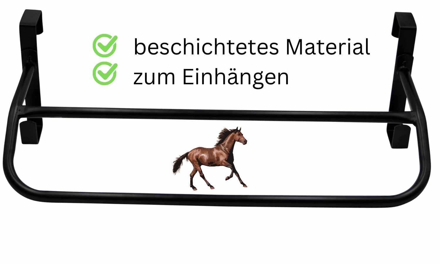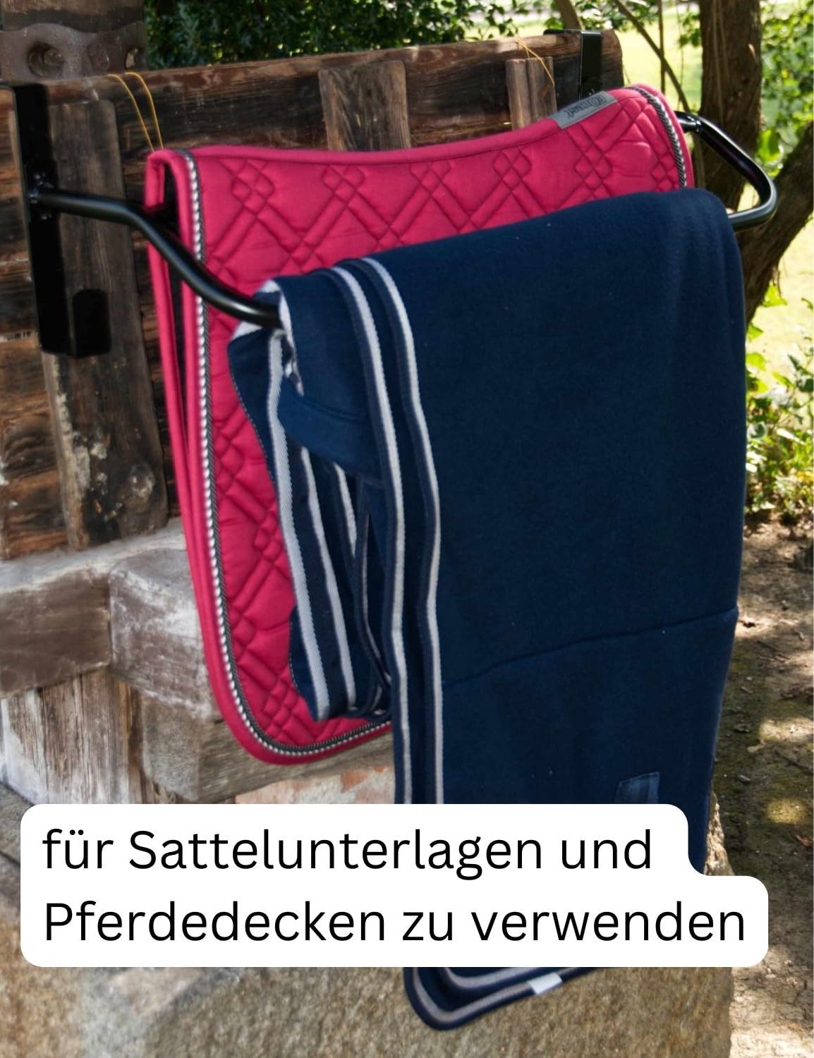 Ordnung im Stall war noch nie so einfach! Dieses praktische Set mit 2 Pferdedeckenhaltern bietet Platz für ganze 6 Pferdedecken. Jeder Halter hat 3 extra breite und schwenkbare Bügel - da können deine Decken und Schabracken richtig durchlüften und trocknen. Keine feuchten, müffelnden Decken mehr! Aus stabilem Metallrohr und pulverbeschichtet in schwarz, damit's auch im feuchten Stall nicht rostet. Maße: ca. 90cm hoch und 75cm tief - passt in fast jeden Stall. Die Montage ist super einfach, das Teil kommt zwar zerlegt, aber das Zusammenbauen kriegst du locker hin. Perfekt für Stall-, Abschwitz-, Übergangs- und sogar Satteldecken. Endlich kein Chaos mehr in der Sattelkammer! Deine Decken bleiben sauber, trocken und griffbereit. Ein Must-Have für jeden ordnungsliebenden Pferdebesitzer!
