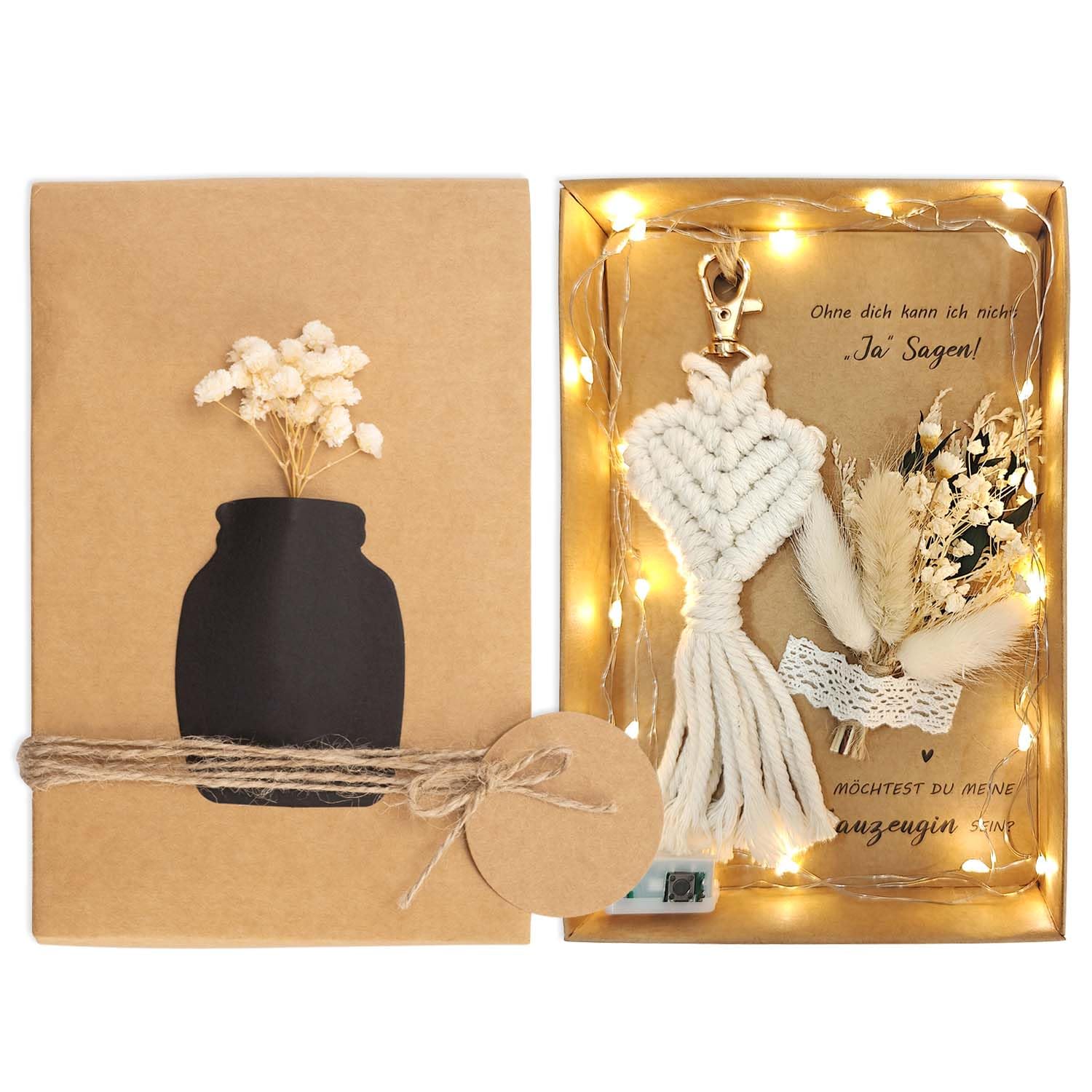 Die perfekte Art, deine beste Freundin zu fragen: 'Möchtest du meine Trauzeugin sein?' Dieses liebevoll zusammengestellte Set überzeugt mit natürlichem Charme und persönlicher Note. Enthalten sind eine hochwertige Kraftpapier-Karte, ein zarter Trockenblumenstrauß und ein handgefertigter Makramee-Schlüsselanhänger.